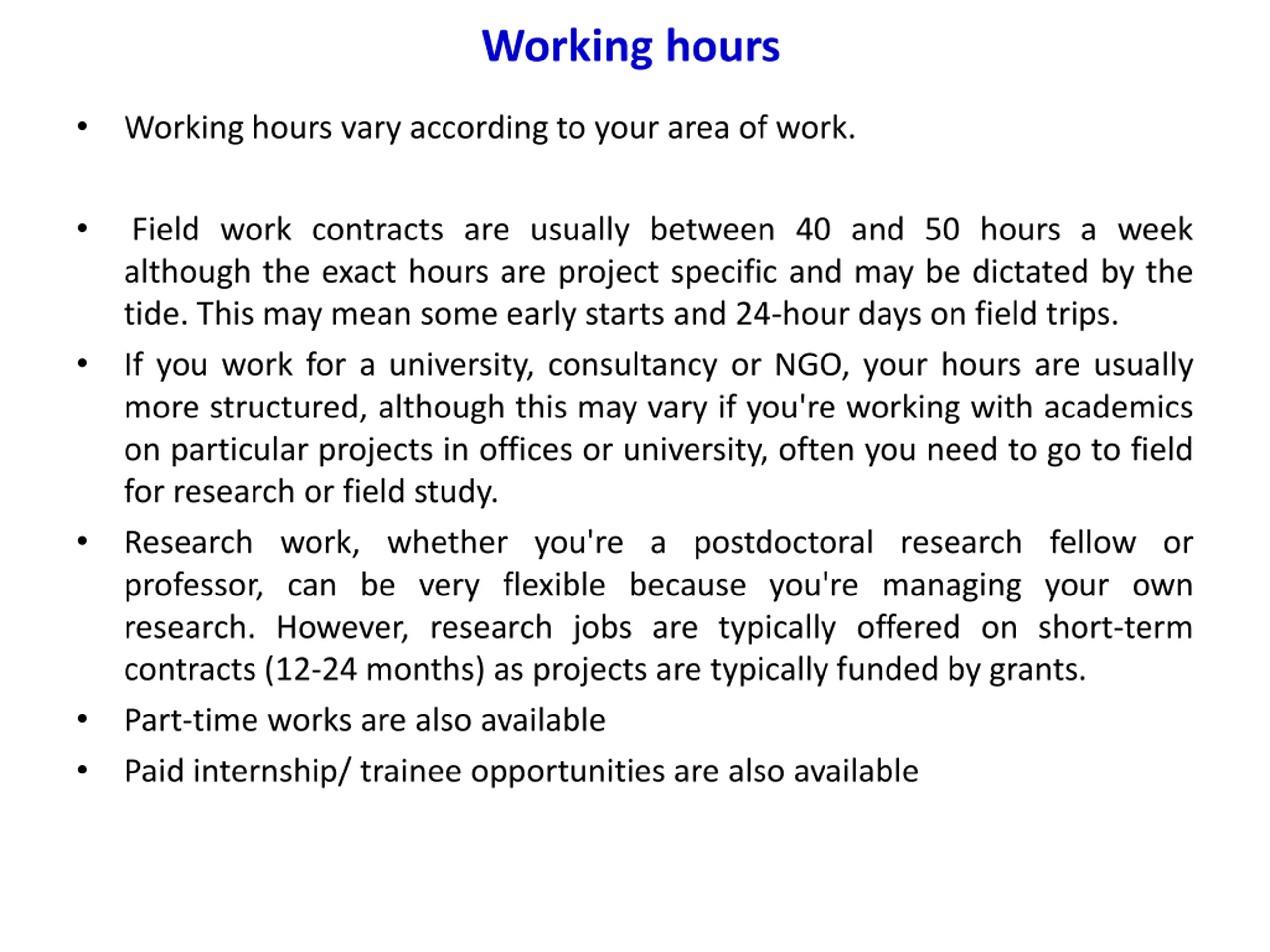 Working hours Working hours vary according to your area of work. Field work contracts are usually between 40 and 50 hours a week although the exact hours are project specific and may be dictated by the tide. This may mean some early starts and 24-hour days on field trips. If you work for a university, consultancy or NGO, your hours are usually more structured, although this may vary if you're working with academics on particular projects in offices or university, often you need to go to field for research or field study. Research work, whether you're a postdoctoral research fellow or professor, can be very flexible because you're managing your own research. However, research jobs are typically offered on short-term contracts (12-24 months) as projects are typically funded by grants. Part-time works are also available Paid internship/ trainee opportunities are also available
