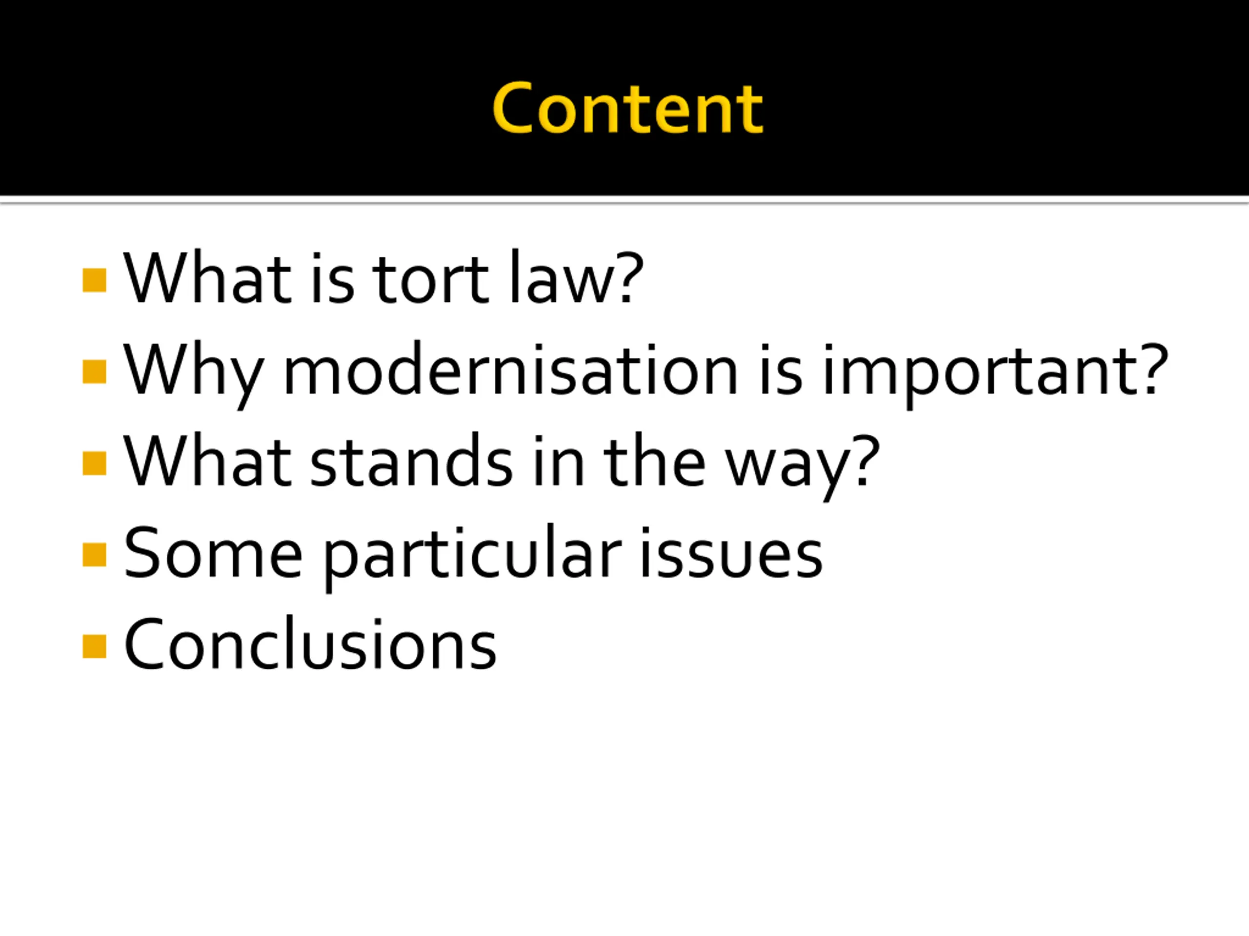 What is tort law? Why modernisationis important? What stands in the way? Some particular issues Conclusions