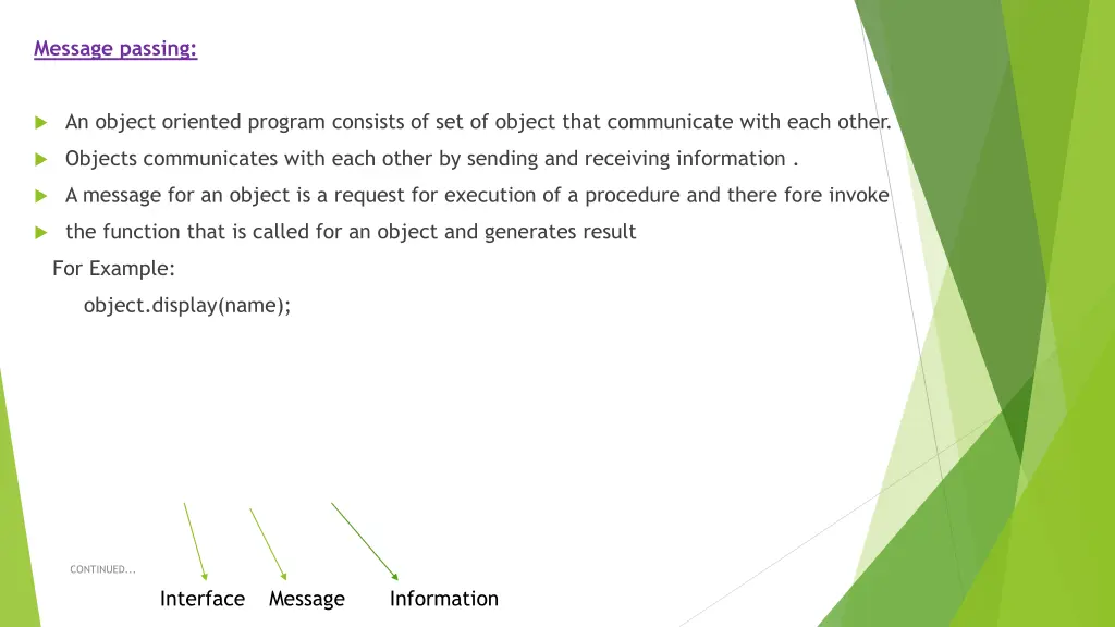 Message passing: An object oriented program consists of set of object that communicate with each other. Objects communicates with each other by sending and receiving information . A message for an object is a request for execution of a procedure and there fore invoke the function that is called for an object and generates result For Example: object.display(name); CONTINUED... Interface Message Information