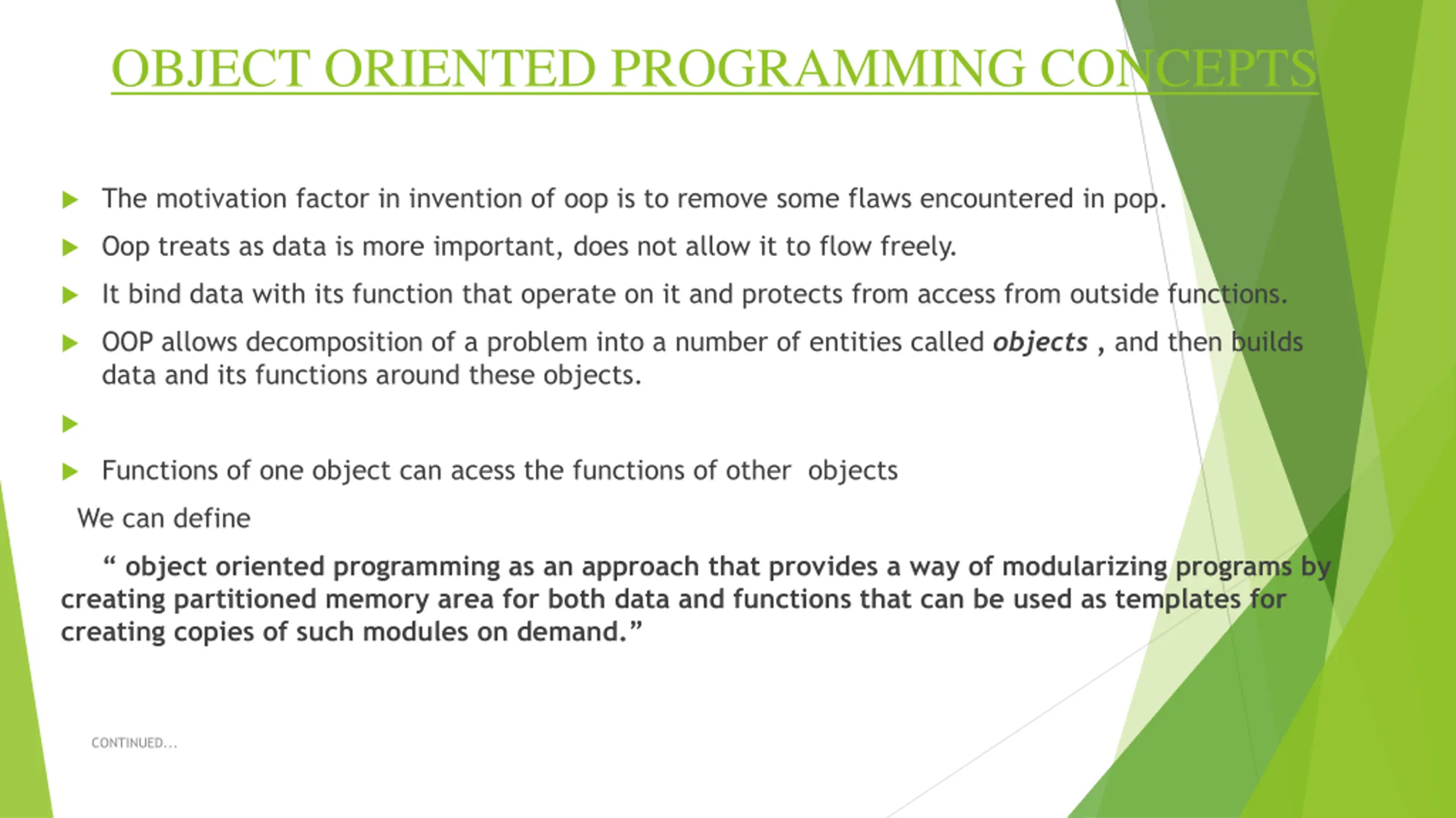 OBJECT ORIENTED PROGRAMMING CONCEPTS The motivation factor in invention of oop is to remove some flaws encountered in pop. Oop treats as data is more important, does not allow it to flow freely. It bind data with its function that operate on it and protects from access from outside functions. OOP allows decomposition of a problem into a number of entities called objects , and then builds data and its functions around these objects. Functions of one object can acess the functions of other objects We can define object oriented programming as an approach that provides a way of modularizing programs by creating partitioned memory area for both data and functions that can be used as templates for creating copies of such modules on demand. CONTINUED...