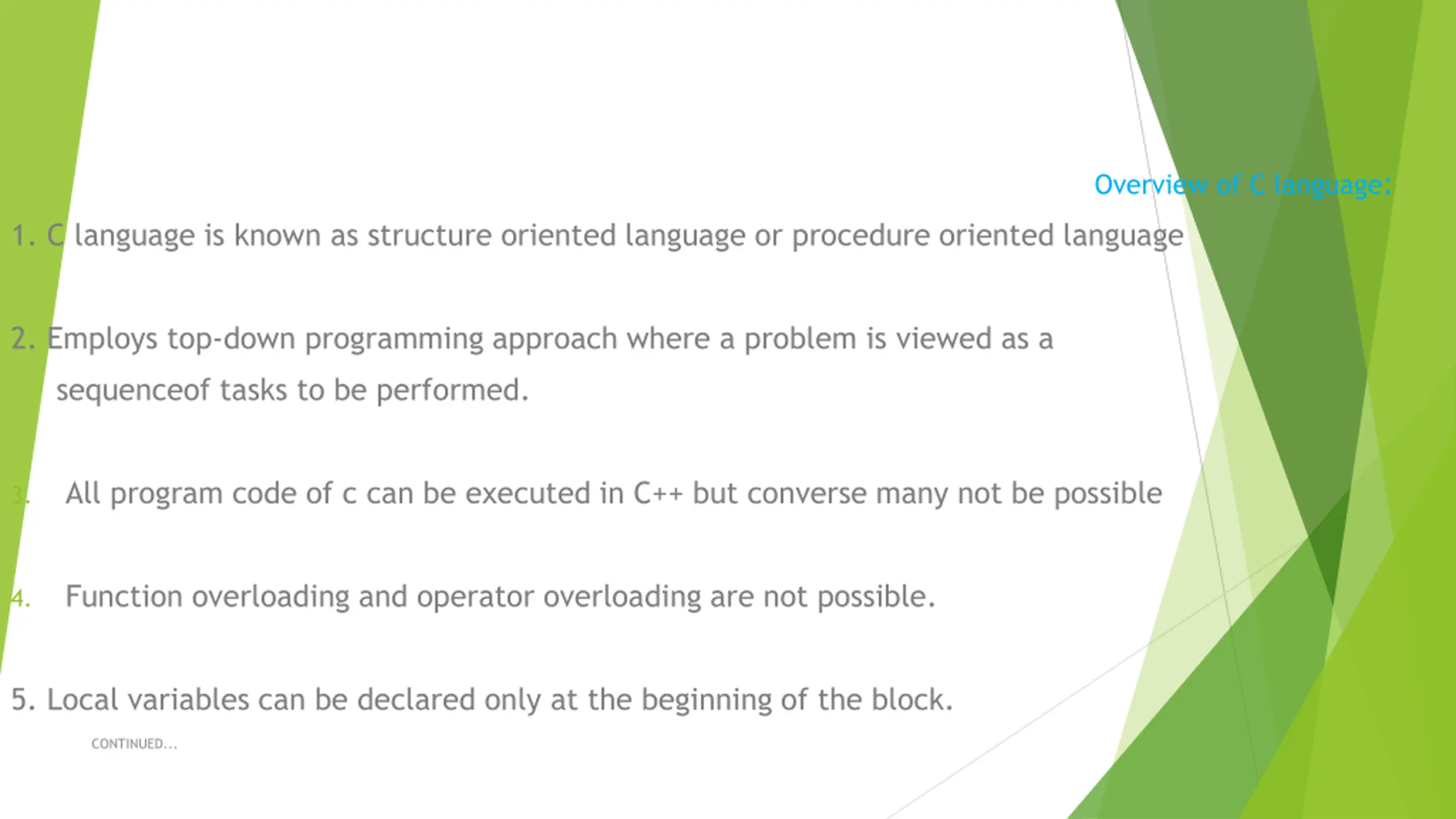 Overview of C language: 1. C language is known as structure oriented language or procedure oriented language 2. Employs top-down programming approach where a problem is viewed as a sequenceof tasks to be performed. All program code of c can be executed in C++ but converse many not be possible 3. Function overloading and operator overloading are not possible. 4. 5. Local variables can be declared only at the beginning of the block. CONTINUED...