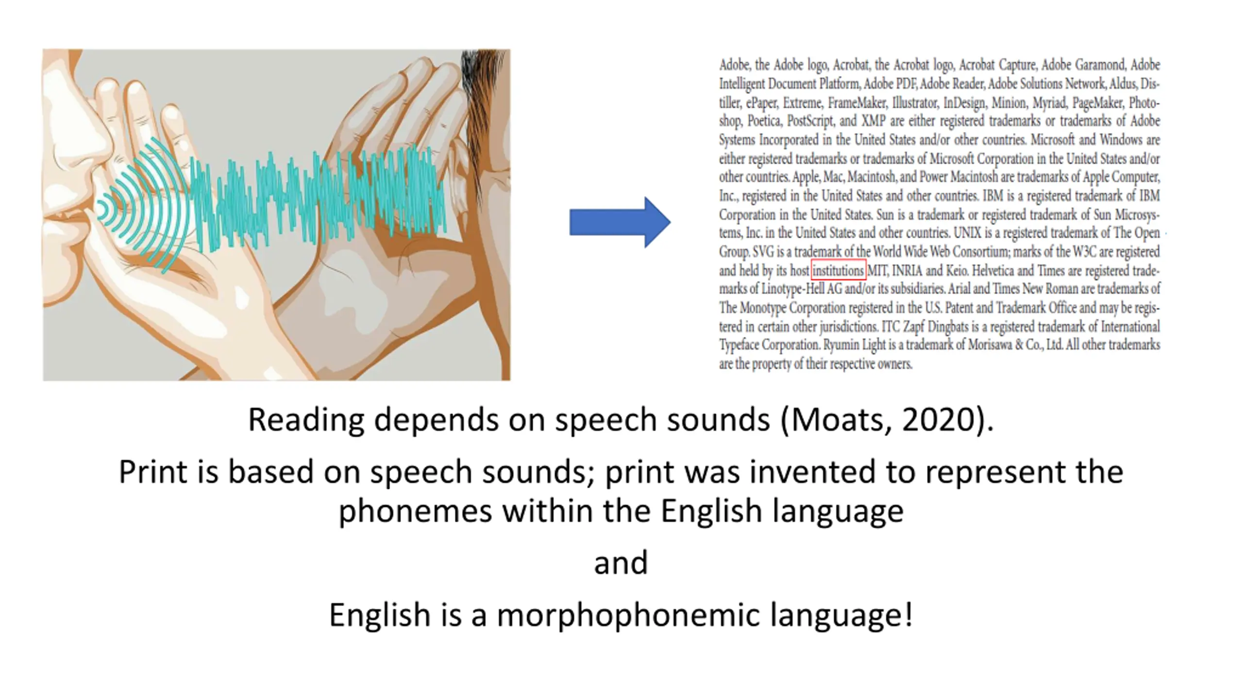 Reading depends on speech sounds (Moats, 2020). Print is based on speech sounds; print was invented to represent the phonemes within the English language and English is a morphophonemic language!