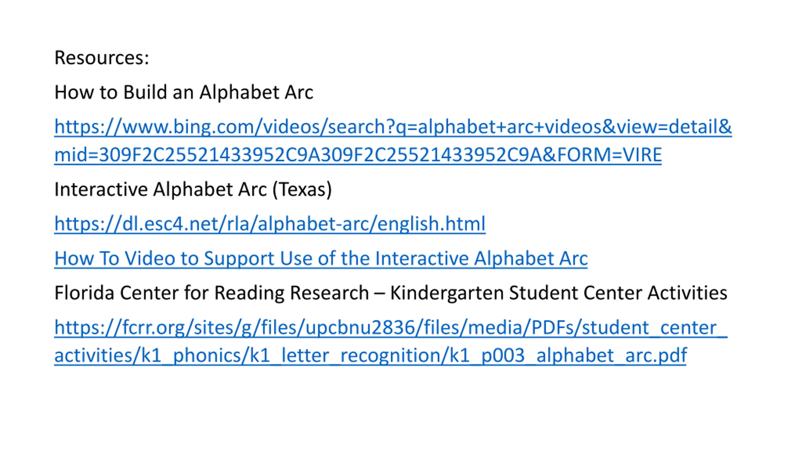 Resources: How to Build an Alphabet Arc https://www.bing.com/videos/search?q=alphabet+arc+videos&view=detail& mid=309F2C25521433952C9A309F2C25521433952C9A&FORM=VIRE Interactive Alphabet Arc (Texas) https://dl.esc4.net/rla/alphabet-arc/english.html How To Video to Support Use of the Interactive Alphabet Arc Florida Center for Reading Research Kindergarten Student Center Activities https://fcrr.org/sites/g/files/upcbnu2836/files/media/PDFs/student_center_ activities/k1_phonics/k1_letter_recognition/k1_p003_alphabet_arc.pdf