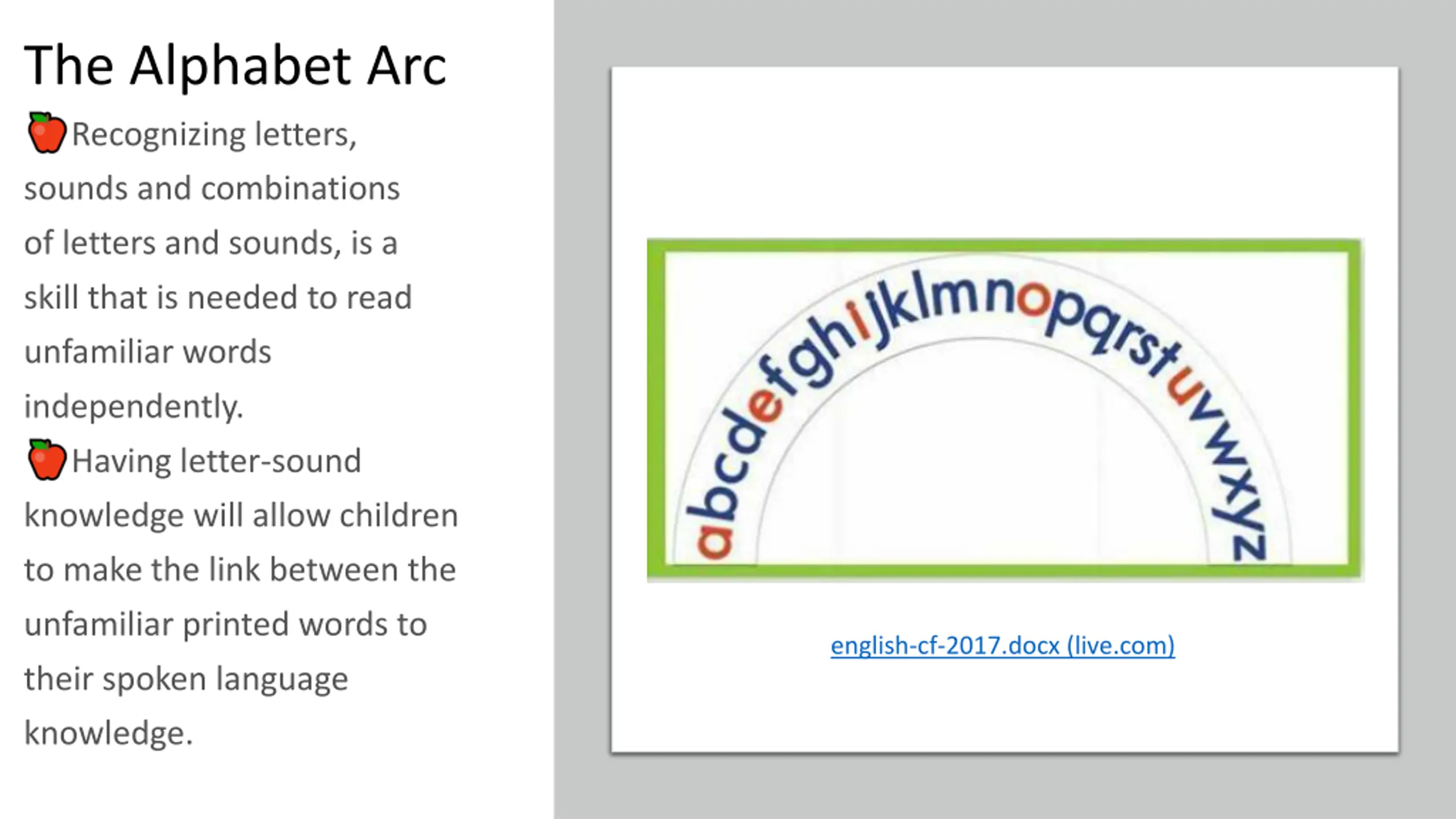 The Alphabet Arc Recognizing letters, sounds and combinations of letters and sounds, is a skill that is needed to read unfamiliar words independently. Having letter-sound knowledge will allow children to make the link between the unfamiliar printed words to their spoken language knowledge. english-cf-2017.docx (live.com)