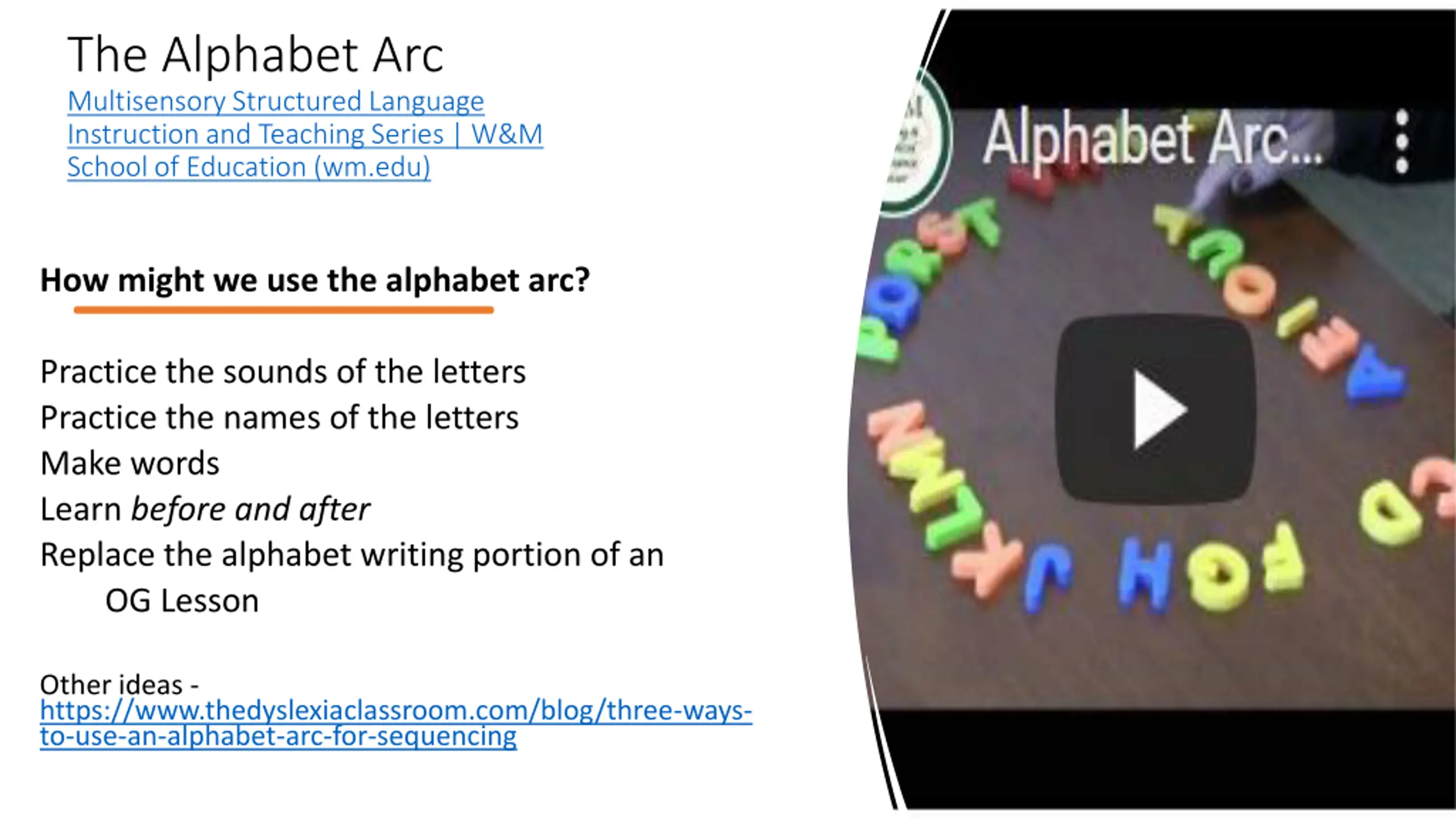 The Alphabet Arc Multisensory Structured Language Instruction and Teaching Series | W&M School of Education (wm.edu) How might we use the alphabet arc? Practice the sounds of the letters Practice the names of the letters Make words Learn before and after Replace the alphabet writing portion of an OG Lesson Other ideas - https://www.thedyslexiaclassroom.com/blog/three-ways- to-use-an-alphabet-arc-for-sequencing