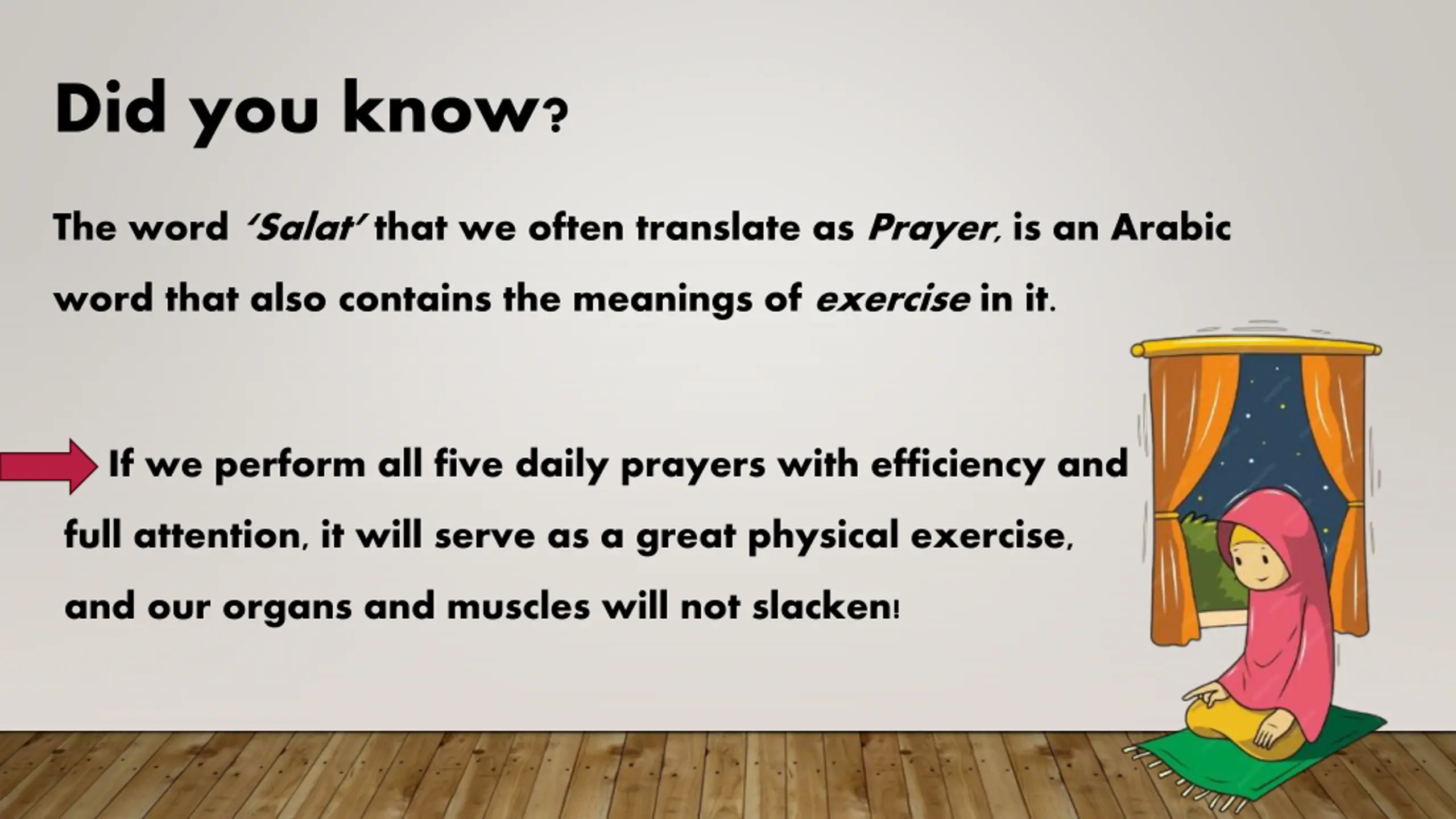 Did you know? The word Salat that we often translate as Prayer, is an Arabic word that also contains the meanings of exercise in it. If we perform all five daily prayers with efficiency and full attention, it will serve as a great physical exercise, and our organs and muscles will not slacken!