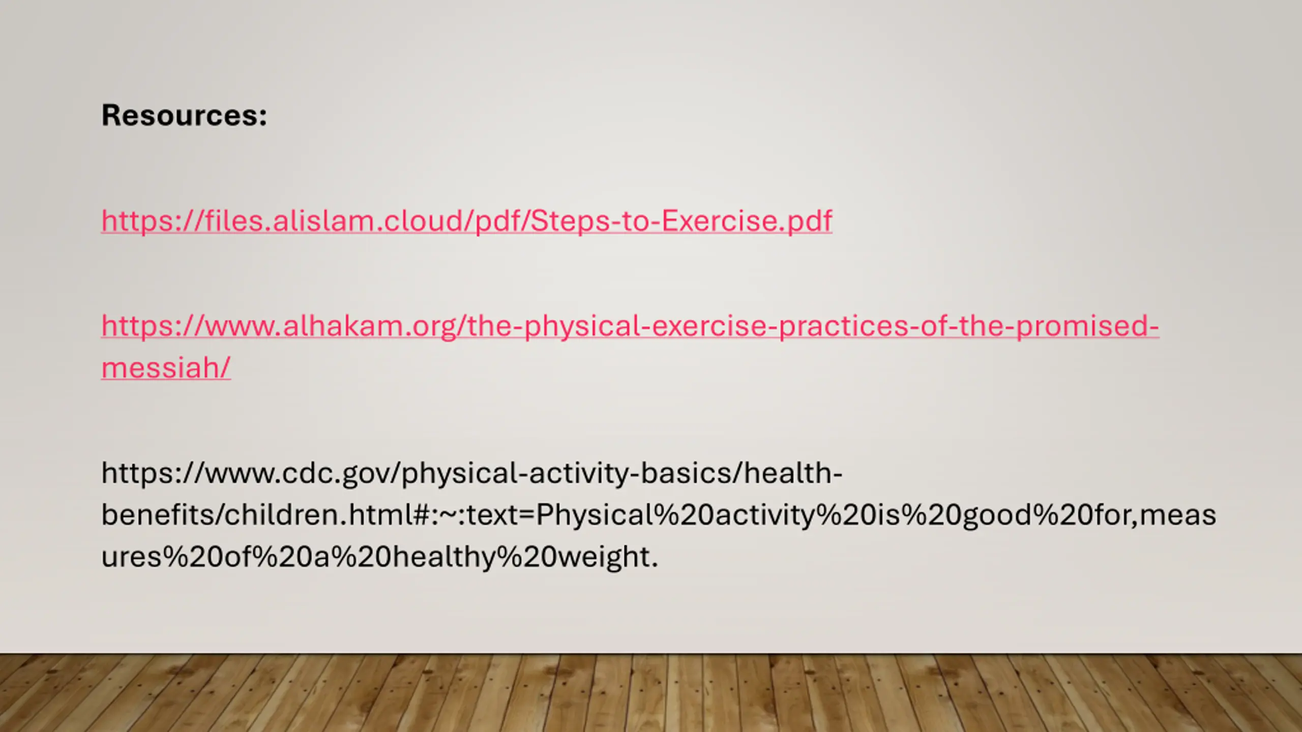 Resources: https://files.alislam.cloud/pdf/Steps-to-Exercise.pdf https://www.alhakam.org/the-physical-exercise-practices-of-the-promised- messiah/ https://www.cdc.gov/physical-activity-basics/health- benefits/children.html#:~:text=Physical%20activity%20is%20good%20for,meas ures%20of%20a%20healthy%20weight.