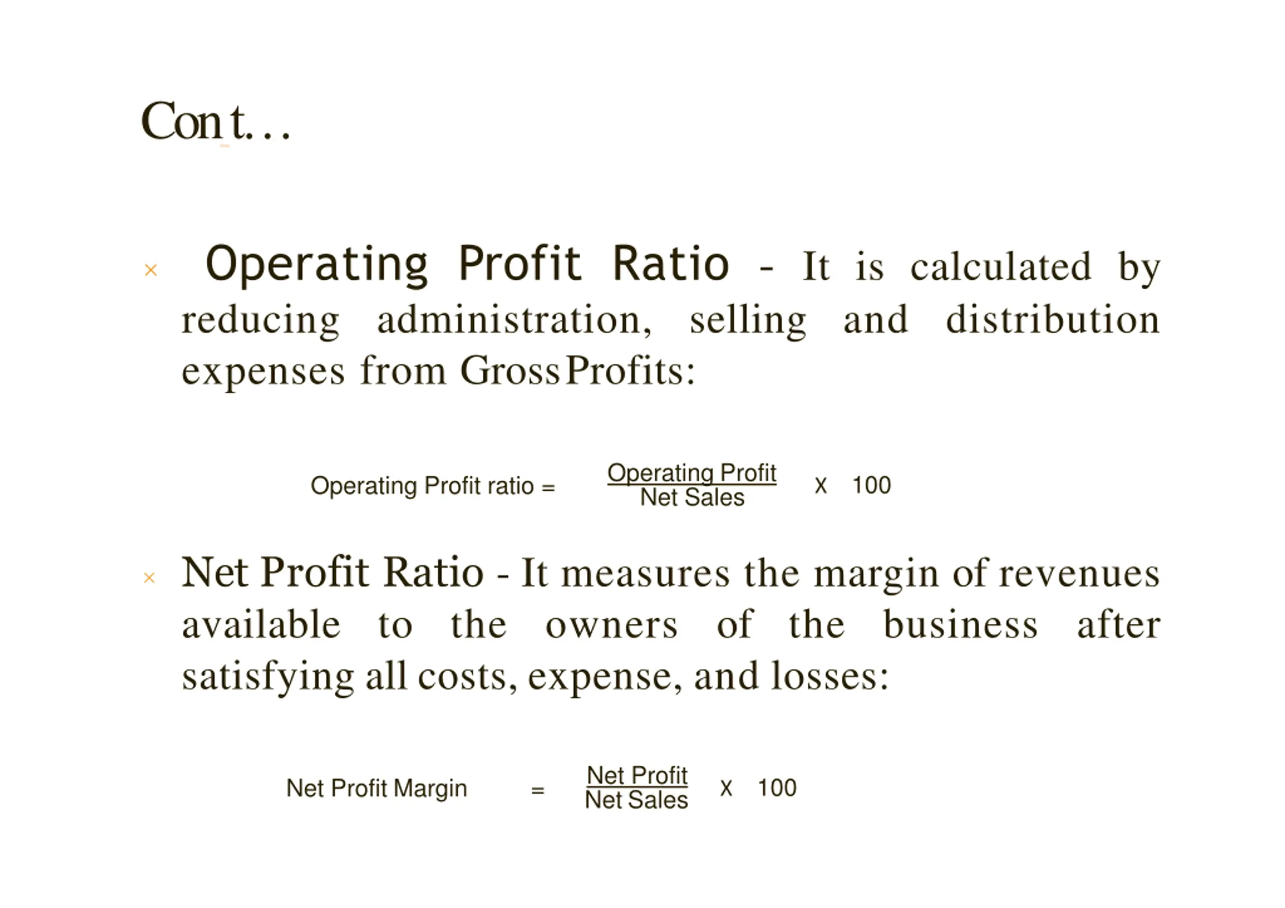 Cont Operating Profit Ratio - It is calculated by reducing administration, selling and distribution expenses from GrossProfits: Operating Profit Net Sales 100 Operating Profit ratio = X Net Profit Ratio - It measures the margin of revenues available to the owners satisfying all costs, expense, and losses: of the business after Net Profit Net Sales 100 Net Profit Margin = X
