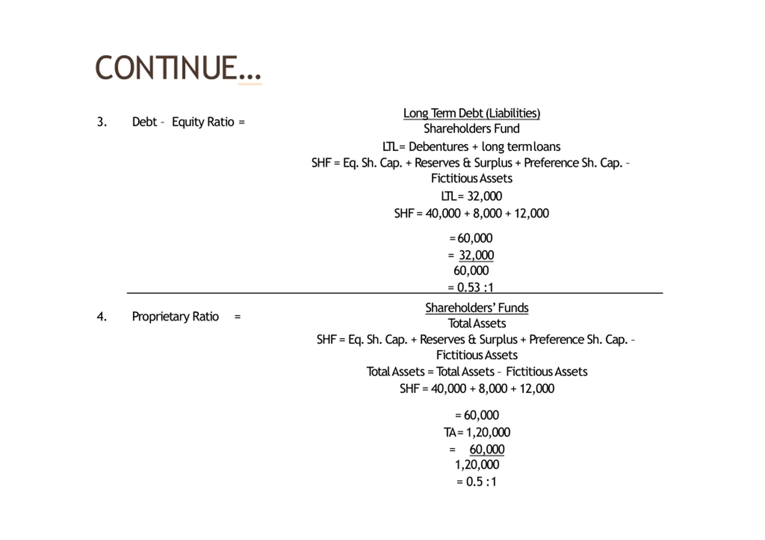 CONTINUE Long T erm Debt(Liabilities) Shareholders Fund L TL = Debentures + long termloans SHF= Eq.Sh.Cap.+ Reserves &Surplus+ PreferenceSh.Cap. FictitiousAssets L TL = 32,000 SHF= 40,000 +8,000 +12,000 3. Debt Equity Ratio = =60,000 = 32,000 60,000 = 0.53 :1 Shareholders Funds T otalAssets 4. ProprietaryRatio = SHF= Eq.Sh.Cap.+ Reserves &Surplus+ PreferenceSh.Cap. FictitiousAssets T otalAssets=T otalAssets FictitiousAssets SHF= 40,000 +8,000 +12,000 =60,000 TA =1,20,000 = 60,000 1,20,000 = 0.5 :1