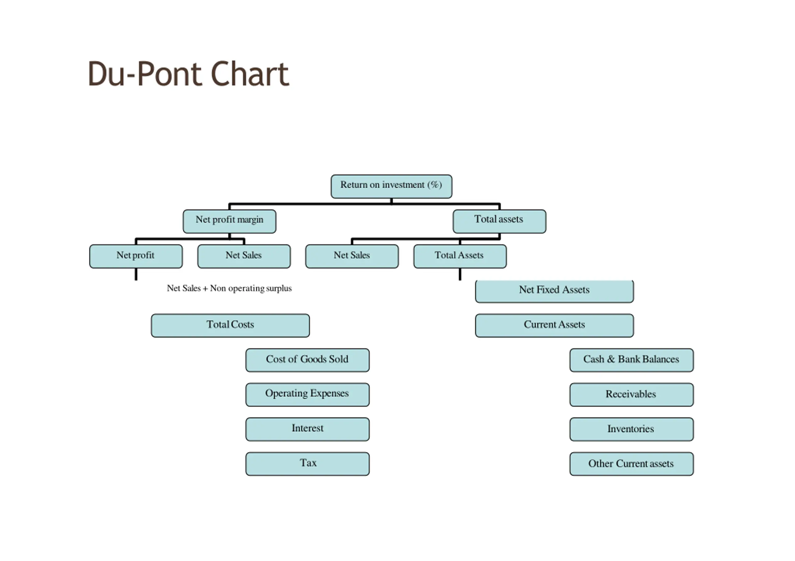 Du-Pont Chart Return on investment (%) Totalassets Net profit margin Netprofit Net Sales Net Sales TotalAssets Net Sales + Non operatingsurplus Net Fixed Assets TotalCosts CurrentAssets Cost of GoodsSold Cash & BankBalances Operating Expenses Receivables Interest Inventories Tax Other Currentassets