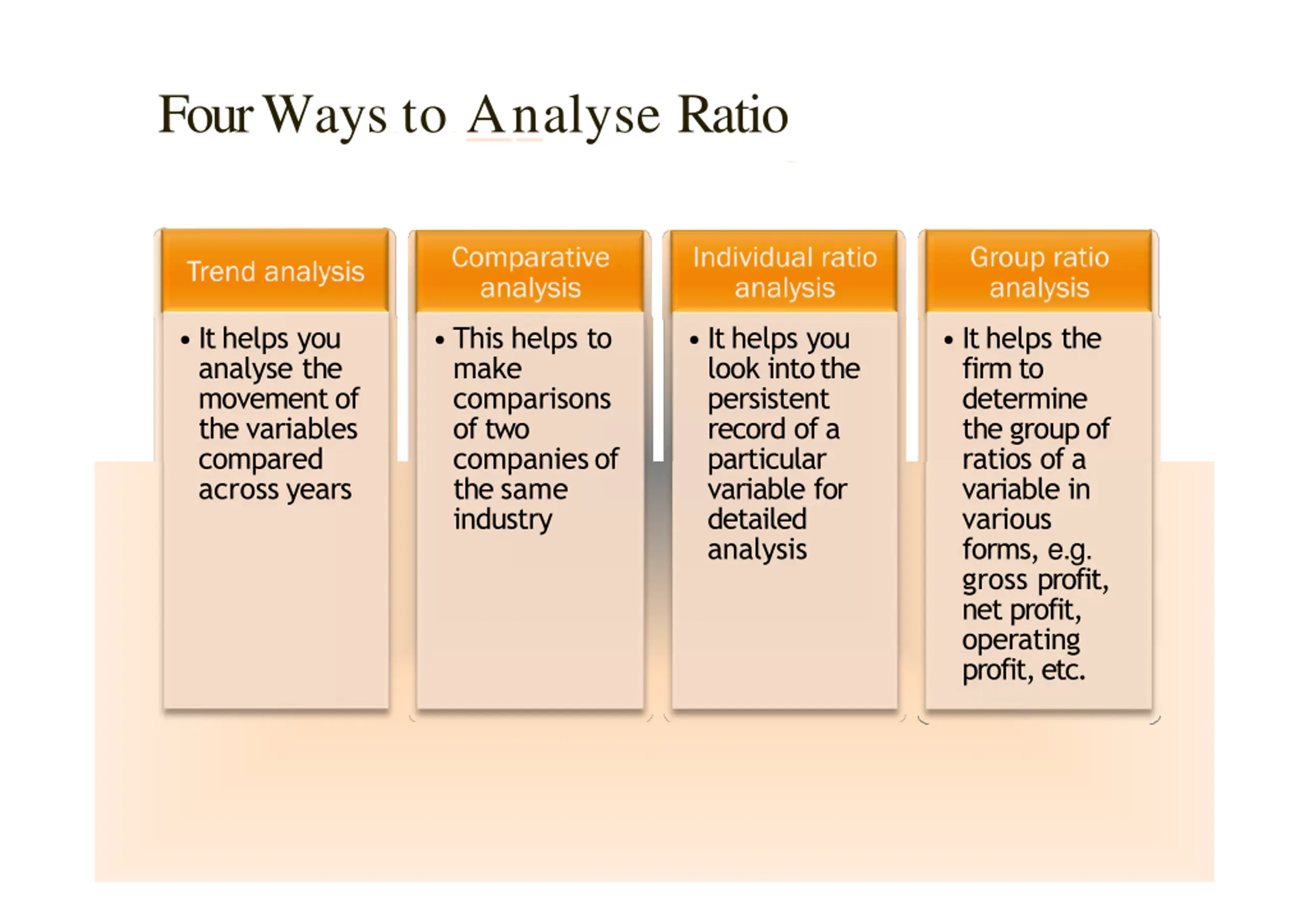Four Ways to Analyse Ratio It helps you analyse the movementof the variables compared across years This helps to make comparisons of two companiesof the same industry It helps you look intothe persistent record of a particular variable for detailed analysis It helps the firm to determine the groupof ratios of a variable in various forms, e.g. gross profit, net profit, operating profit,etc.