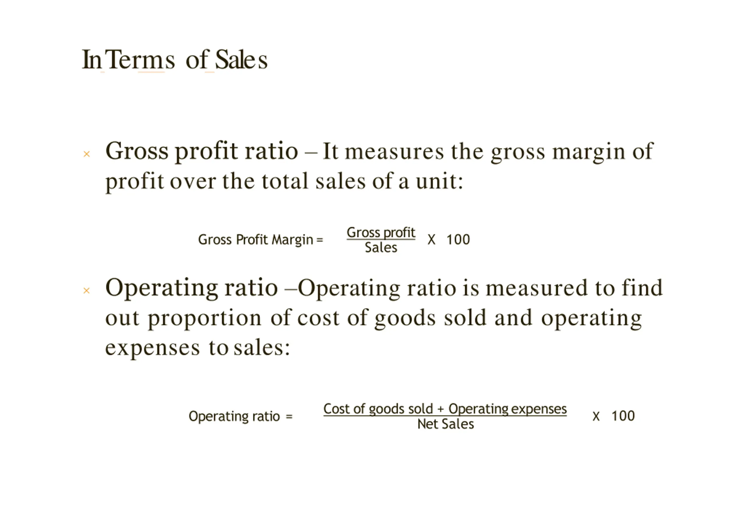 InTe rms o f Sales Gross profit ratio It measures the gross margin of profit over the total sales of a unit: Gross profit Sales Gross Profit Margin= X 100 Operating ratio Operating ratio is measured to find out proportion of cost of goods sold and operating expenses tosales: Cost of goods sold + Operatingexpenses Net Sales X 100 Operating ratio =