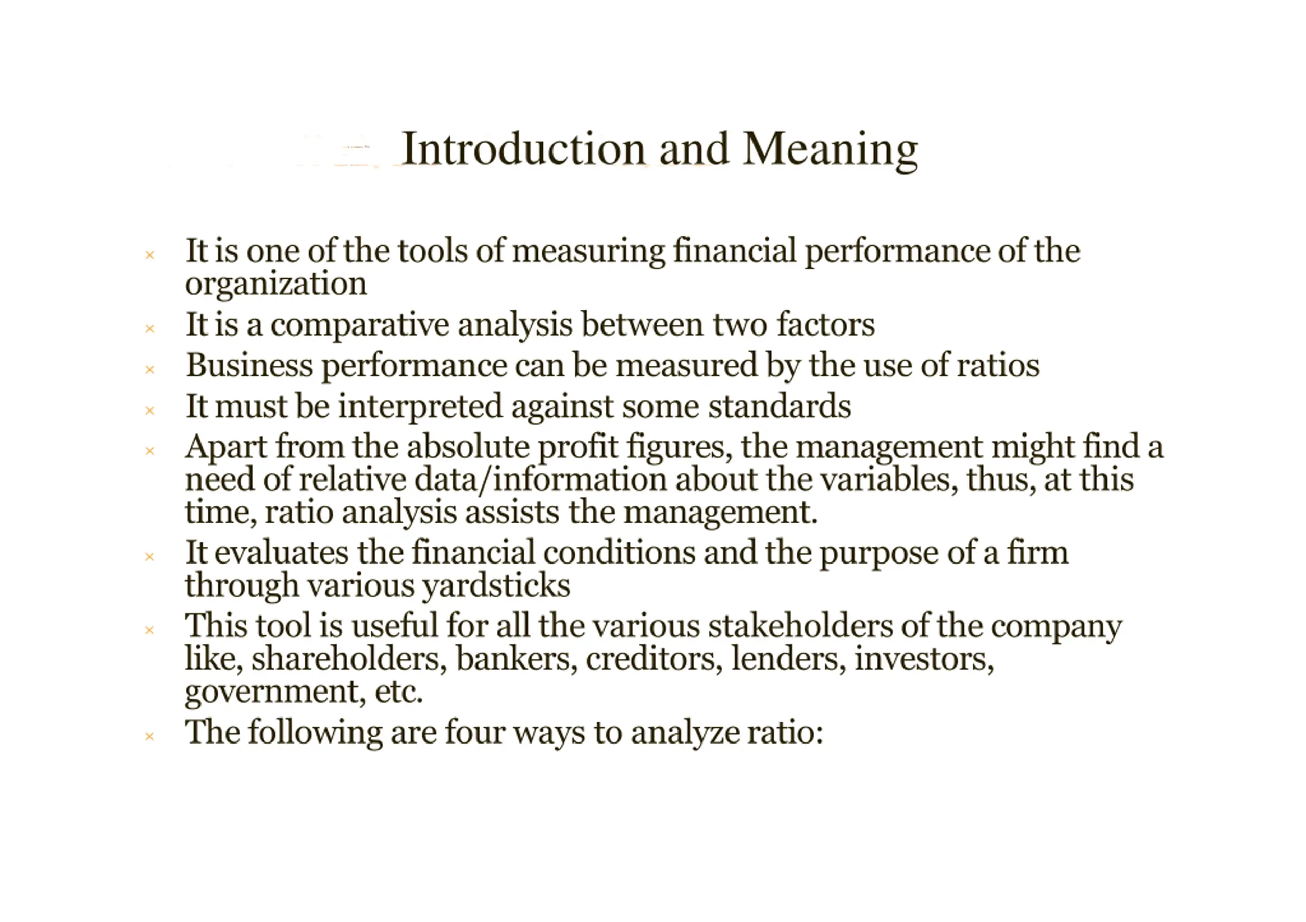 Introduction and Meaning It is one of the tools of measuring financial performance of the organization It is a comparative analysis between two factors Business performance can be measured by the use of ratios It must be interpreted against some standards Apart from the absolute profit figures, the management might find a need of relative data/information about the variables, thus, at this time, ratio analysis assists the management. It evaluates the financial conditions and the purpose of a firm through various yardsticks This tool is useful for all the various stakeholders of the company like, shareholders, bankers, creditors, lenders, investors, government, etc. The following are four ways to analyzeratio: