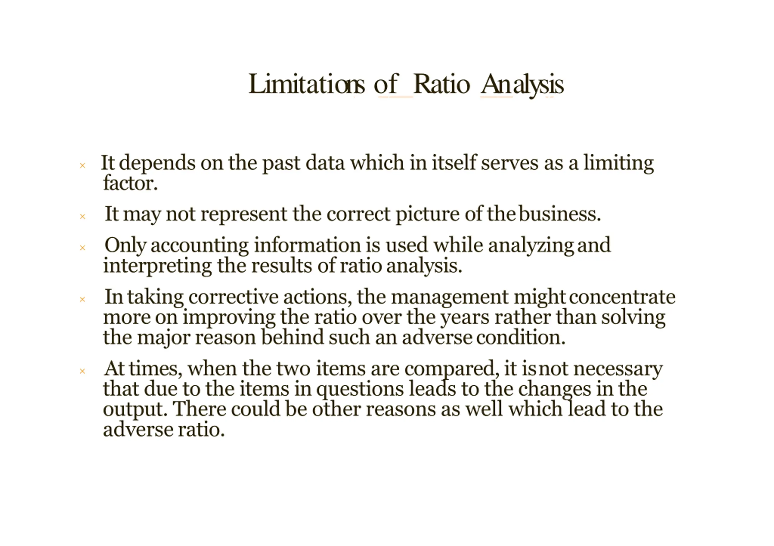 Limitatio ns of Ratio Analysis It depends on the past data which in itself serves as a limiting factor. It may not represent the correct picture of thebusiness. Only accounting information is used while analyzingand interpreting the results of ratioanalysis. In taking corrective actions, the management mightconcentrate more on improving the ratio over the years rather than solving the major reason behind such an adversecondition. At times, when the two items are compared, it isnot necessary that due to the items in questions leads to the changes in the output. There could be other reasons as well which lead to the adverseratio.