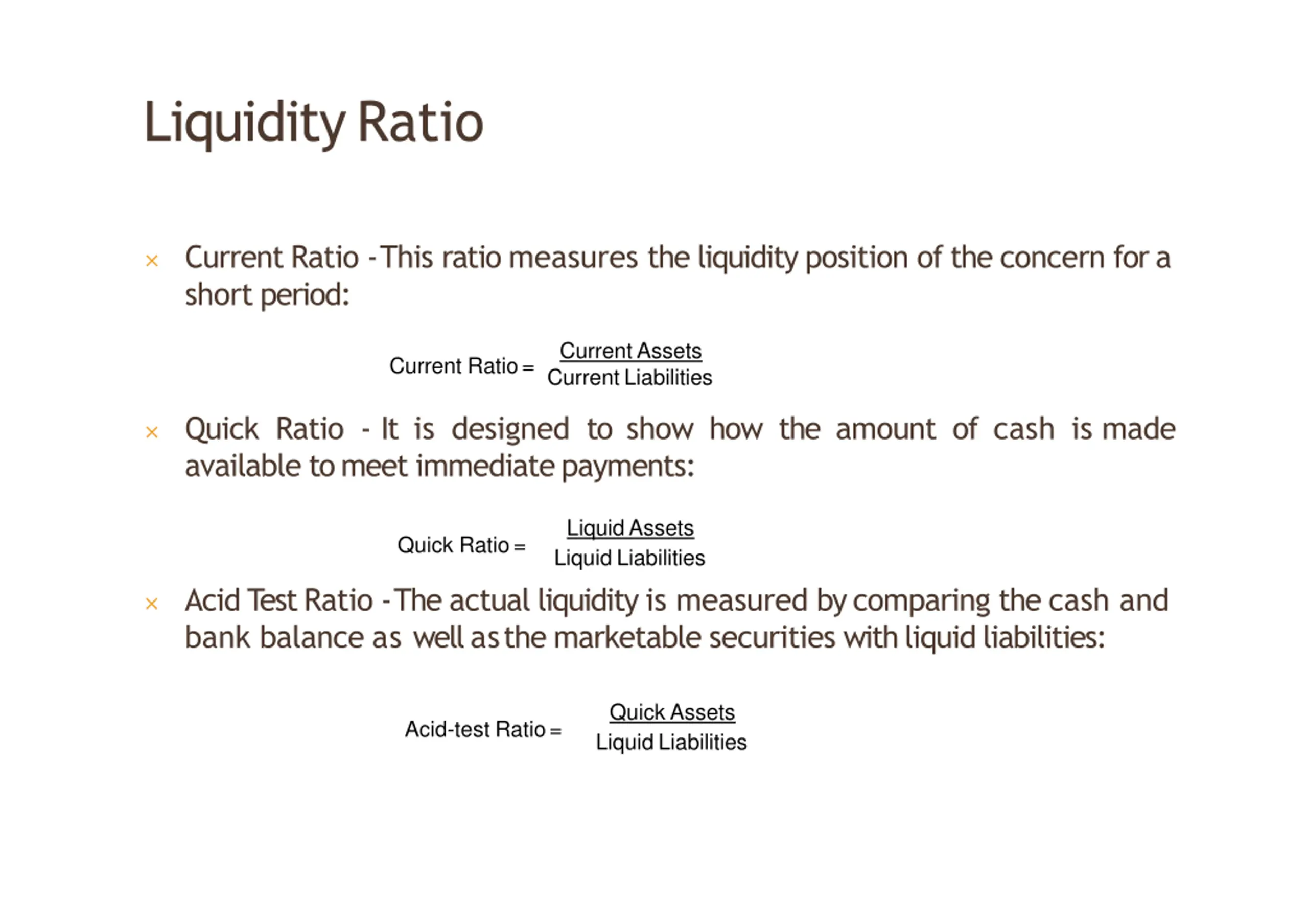 LiquidityRatio Current Ratio -This ratio measures the liquidity position of the concern for a short period: Current Assets CurrentLiabilities Current Ratio= Quick Ratio - It is designed to show how the amount of cash is made available to meet immediatepayments: Liquid Assets Liquid Liabilities Quick Ratio= Acid Test Ratio -The actual liquidity is measured by comparing the cash and bank balance as well asthe marketable securities with liquid liabilities: Quick Assets Liquid Liabilities Acid-test Ratio=