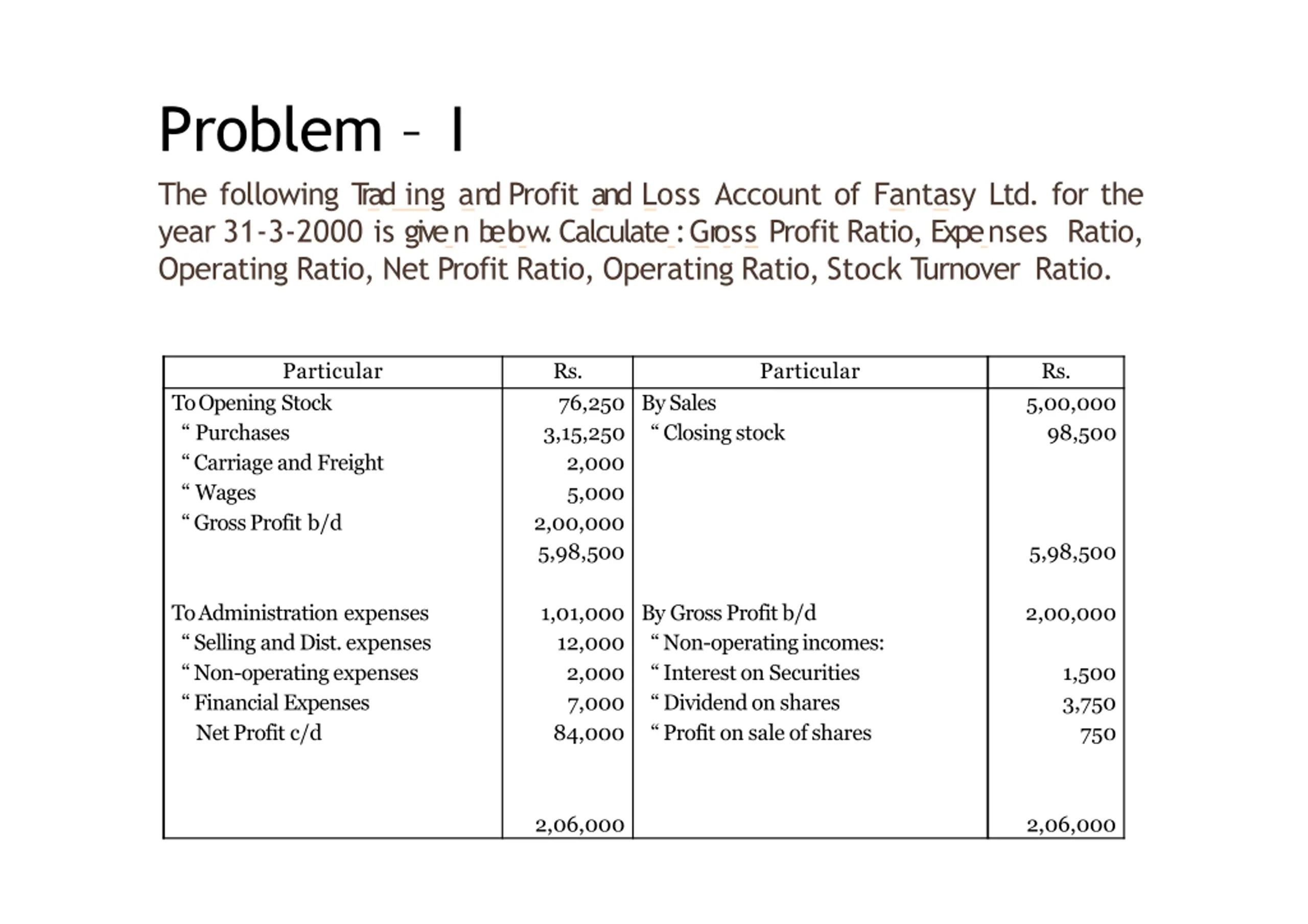 Problem I The following T rad ing an dProfit and Loss Account of Fantasy Ltd. for the year 31-3-2000 is given b el ow .Calculate:Gr oss Profit Ratio, Expenses Ratio, Operating Ratio, Net Profit Ratio, Operating Ratio, Stock Turnover Ratio. Particular Rs. 76,250 BySales 3,15,250 2,000 5,000 2,00,000 5,98,500 Particular Rs. To Opening Stock Purchases Carriage and Freight Wages Gross Profit b/d 5,00,000 98,500 Closingstock 5,98,500 To Administration expenses Selling and Dist.expenses Non-operatingexpenses FinancialExpenses Net Profit c/d 1,01,000 By Gross Profitb/d 12,000 Non-operatingincomes: 2,000 Interest on Securities 7,000 Dividend onshares 84,000 Profit on sale ofshares 2,00,000 1,500 3,750 750 2,06,000 2,06,000