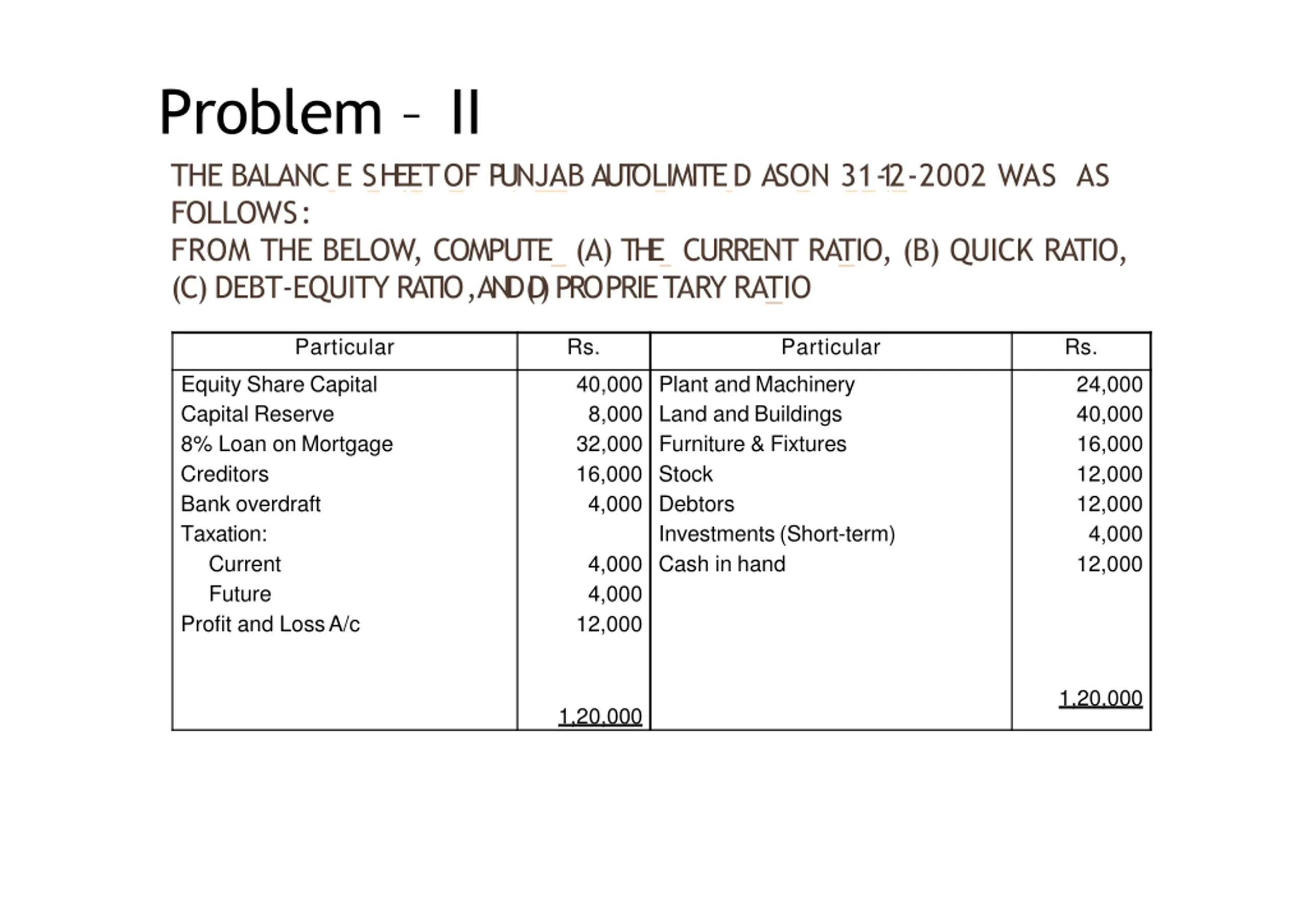 Problem II THE BALANCE SH EET OF P UNJAB AUT O LIMITED AS ON 31- 1 2-2002 WAS AS FOLLOWS: FROM THE BELOW, COMPUTE (A) THE CURRENT RATIO, (B) QUICK RATIO, (C) DEBT-EQUITY RA TIO , AND ( D ) PRO PRIE TARY RATIO Particular Rs. Particular Rs. Equity Share Capital Capital Reserve 8% Loan on Mortgage Creditors Bank overdraft Taxation: Current Future Profit and LossA/c 40,000 Plant and Machinery 8,000 Land and Buildings 32,000 Furniture & Fixtures 16,000 Stock 4,000 Debtors Investments(Short-term) 4,000 Cash in hand 4,000 12,000 24,000 40,000 16,000 12,000 12,000 4,000 12,000 1,20,000 1,20,000