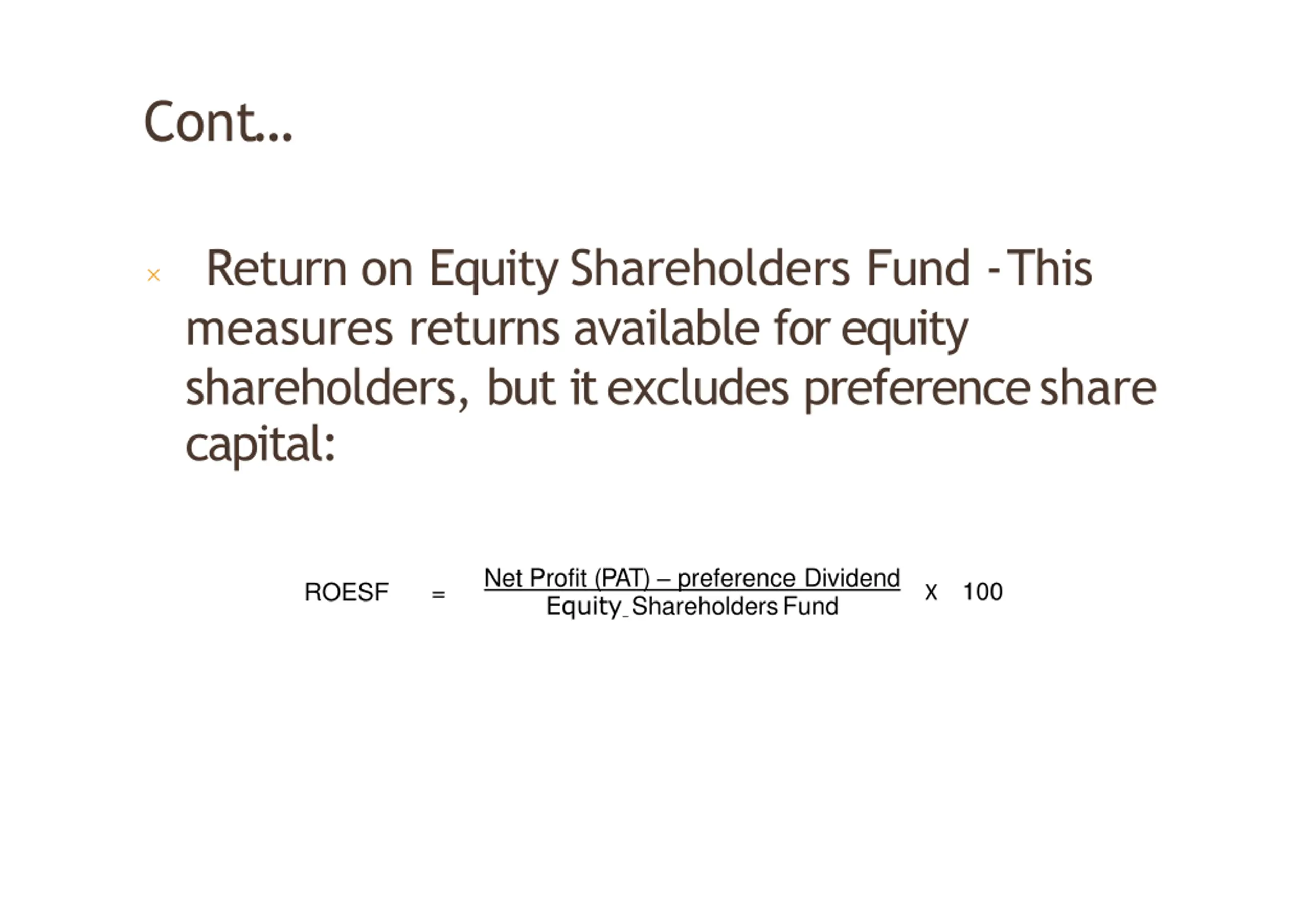 Cont Return on Equity Shareholders Fund -This measures returns available for equity shareholders, but it excludes preferenceshare capital: Net Profit (PAT) preference Dividend Equity ShareholdersFund 100 ROESF = X