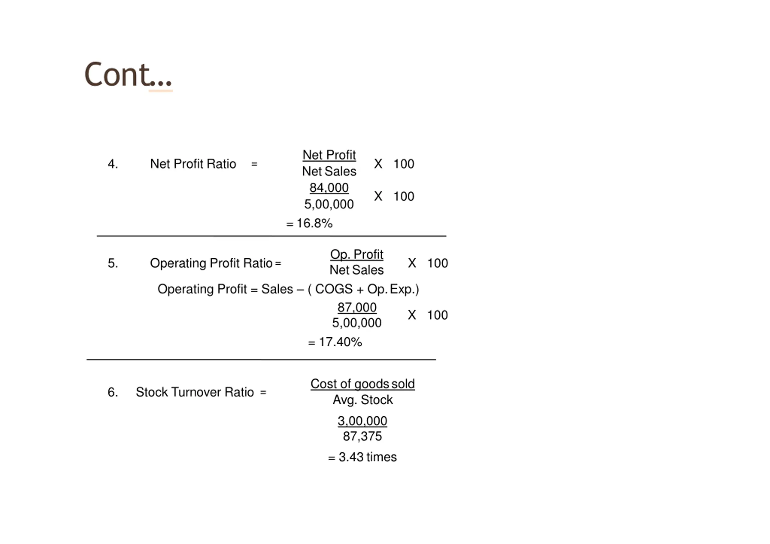 Cont Net Profit Net Sales 84,000 5,00,000 = 16.8% 4. Net Profit Ratio X 100 = X 100 Op. Profit Net Sales 5. Operating Profit Ratio= X 100 Operating Profit = Sales ( COGS + Op.Exp.) 87,000 5,00,000 = 17.40% X 100 Cost of goodssold Avg. Stock 3,00,000 87,375 = 3.43 times 6. Stock Turnover Ratio =