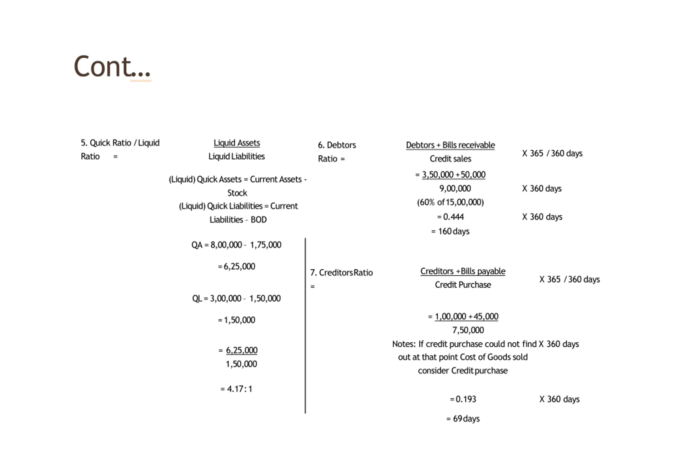 Cont 5. Quick Ratio / Liquid Ratio = Liquid Assets LiquidLiabilities 6. Debtors Ratio = Debtors+Billsreceivable Creditsales X 365 / 360 days = 3,50,000 +50,000 9,00,000 (60% of15,00,000) =0.444 = 160days (Liquid)QuickAssets = CurrentAssets - Stock (Liquid)QuickLiabilities=Current Liabilities BOD X 360 days X 360 days QA=8,00,000 1,75,000 =6,25,000 Creditors +Bills payable CreditPurchase 7. CreditorsRatio = X 365 / 360 days QL=3,00,000 1,50,000 = 1,00,000 +45,000 7,50,000 =1,50,000 Notes: If credit purchase could not find X 360 days outatthat point Cost ofGoods sold consider Creditpurchase = 6,25,000 1,50,000 = 4.17: 1 =0.193 X 360 days = 69days