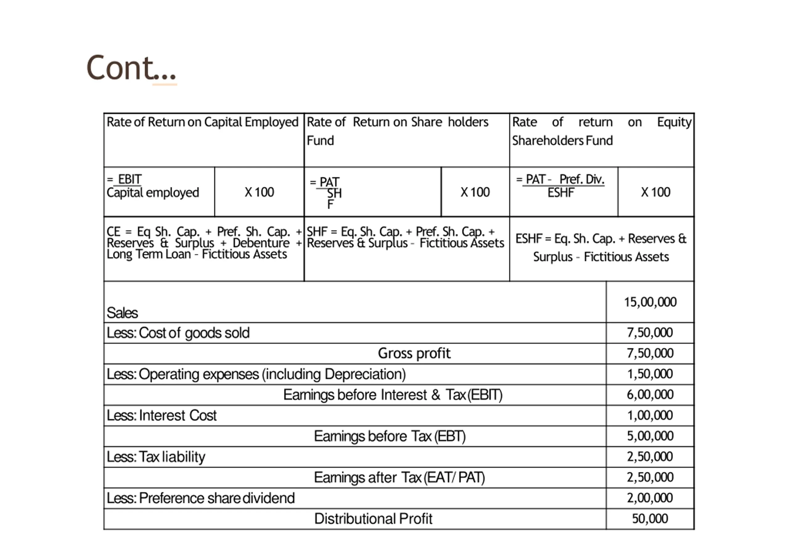 Cont RateofReturnonCapitalEmployed Rate of Return on Share holders Rate ShareholdersFund of return on Equity Fund = EBIT Capitalemployed = PAT Pref.Div. ESHF = PAT X100 X100 X100 SH F CE = Eq Sh. Cap. + Pref. Sh. Cap. + Reserves & Surplus + Debenture + Long TermLoan Fictitious Assets SHF = Eq. Sh. Cap. + Pref. Sh. Cap. + Reserves&Surplus FictitiousAssetsESHF= Eq.Sh.Cap.+ Reserves & Surplus Fictitious Assets 15,00,000 Sales Less: Cost of goodssold 7,50,000 7,50,000 1,50,000 6,00,000 1,00,000 5,00,000 2,50,000 2,50,000 2,00,000 50,000 Gross profit Less: Operating expenses (including Depreciation) Earnings before Interest & Tax(EBIT) Less: Interest Cost Earnings before Tax(EBT) Less: Taxliability Earnings after Tax (EAT/PAT) Less: Preference sharedividend DistributionalProfit