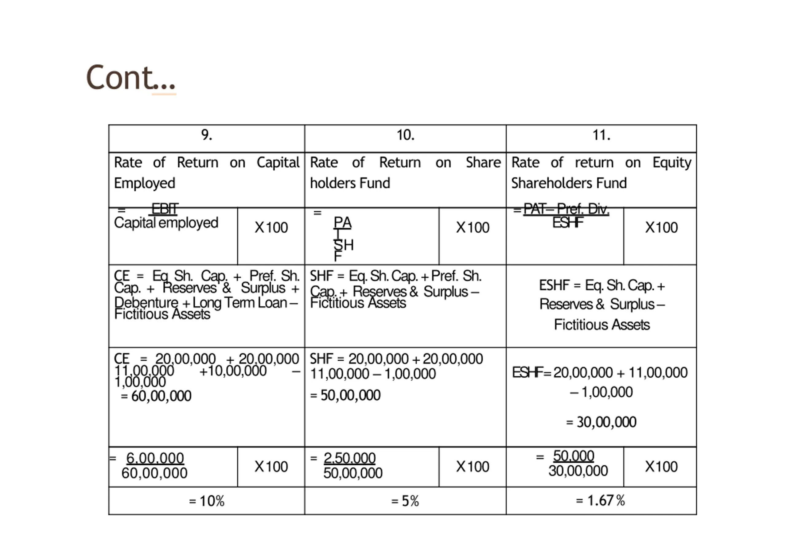 Cont 9. 10. 11. Rate of Return on Capital Employed Rate holders Fund of Return on Share Rate of return on Equity Shareholders Fund = Capitalemployed EBIT = PAT Pref. Div. ESHF = PA T SH F X100 X100 X100 CE = Eq Sh. Cap. + Pref. Sh. Cap. + Reserves & Surplus + Debenture + Long Term Loan FictitiousAssets SHF = Eq. Sh. Cap. + Pref. Sh. Cap. + Reserves & Surplus FictitiousAssets ESHF = Eq. Sh. Cap.+ Reserves & Surplus FictitiousAssets CE = 20,00,000 + 20,00,000 11,00,000 +10,00,000 1,00,000 = 60,00,000 SHF = 20,00,000 +20,00,000 11,00,000 1,00,000 =50,00,000 ESHF = 20,00,000 +11,00,000 1,00,000 =30,00,000 = 50,000 30,00,000 = 6,00,000 60,00,000 = 2,50,000 50,00,000 X100 X100 X100 = 1.67% =10% =5%