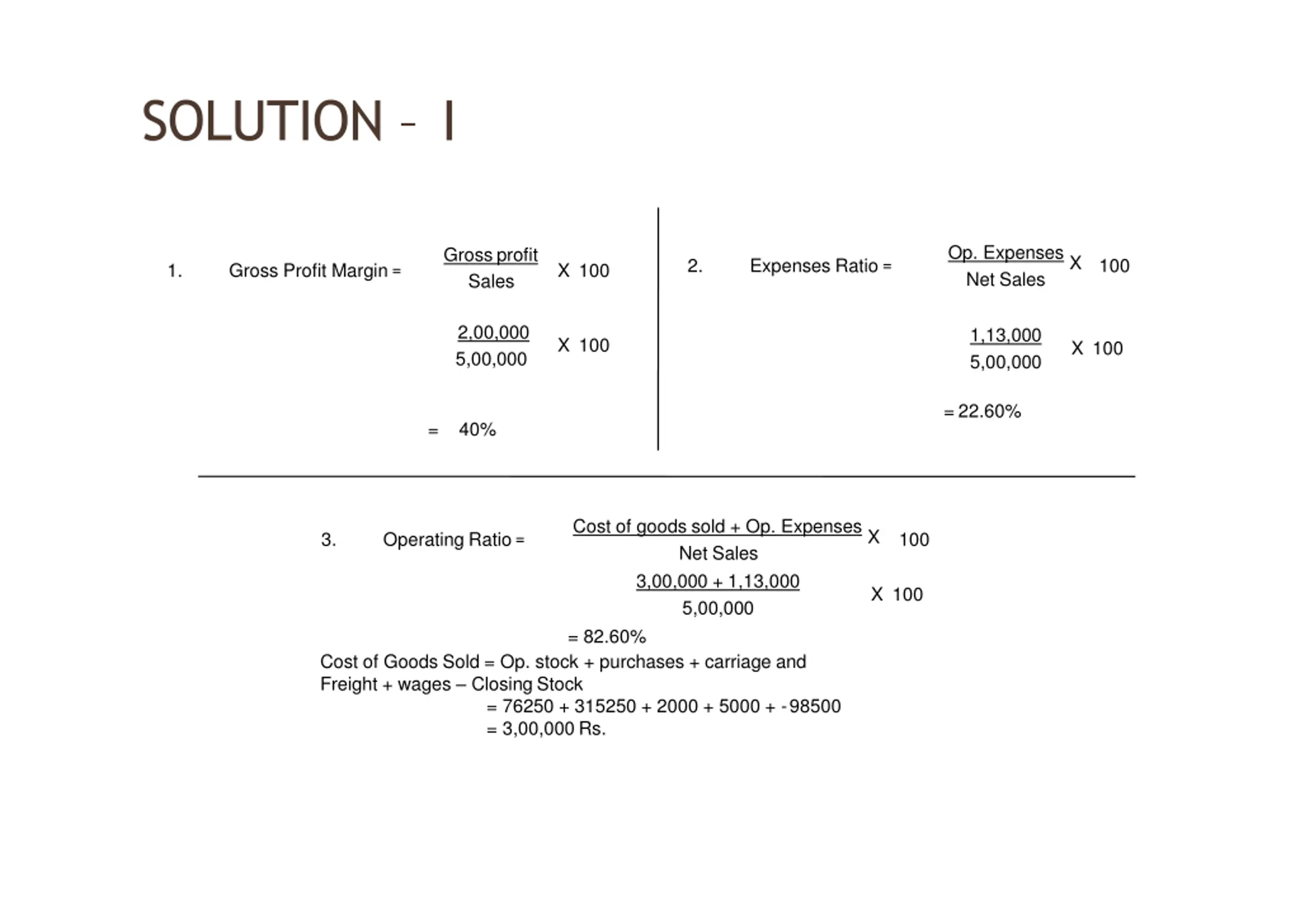 SOLUTION I Op. ExpensesX Net Sales Grossprofit Sales 2. Expenses Ratio = 100 1. Gross Profit Margin = X 100 2,00,000 5,00,000 1,13,000 5,00,000 X 100 X 100 = 22.60% = 40% Cost of goods sold + Op. ExpensesX Net Sales 3,00,000 + 1,13,000 5,00,000 = 82.60% 3. Operating Ratio= 100 X 100 Cost of Goods Sold = Op. stock + purchases + carriage and Freight + wages Closing Stock = 76250 + 315250 + 2000 + 5000 + -98500 = 3,00,000 Rs.