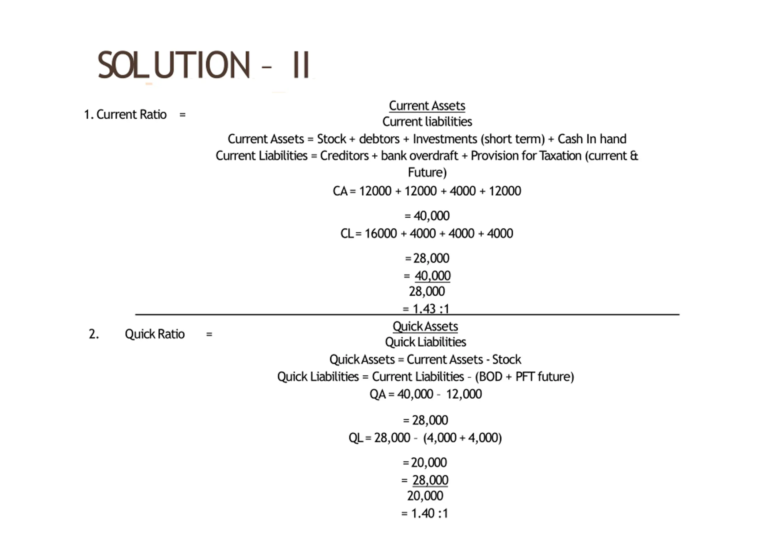 SOLUTION II Current Assets Currentliabilities 1.Current Ratio = Current Assets = Stock + debtors + Investments (short term) + Cash In hand CurrentLiabilities = Creditors+ bankoverdraft+ ProvisionforTaxation(current & Future) CA= 12000 +12000 +4000 +12000 =40,000 CL=16000 +4000 +4000 +4000 =28,000 = 40,000 28,000 = 1.43 :1 QuickAssets QuickLiabilities 2. QuickRatio = QuickAssets=CurrentAssets-Stock Quick Liabilities = Current Liabilities (BOD + PFT future) QA=40,000 12,000 =28,000 QL=28,000 (4,000+4,000) =20,000 = 28,000 20,000 = 1.40 :1