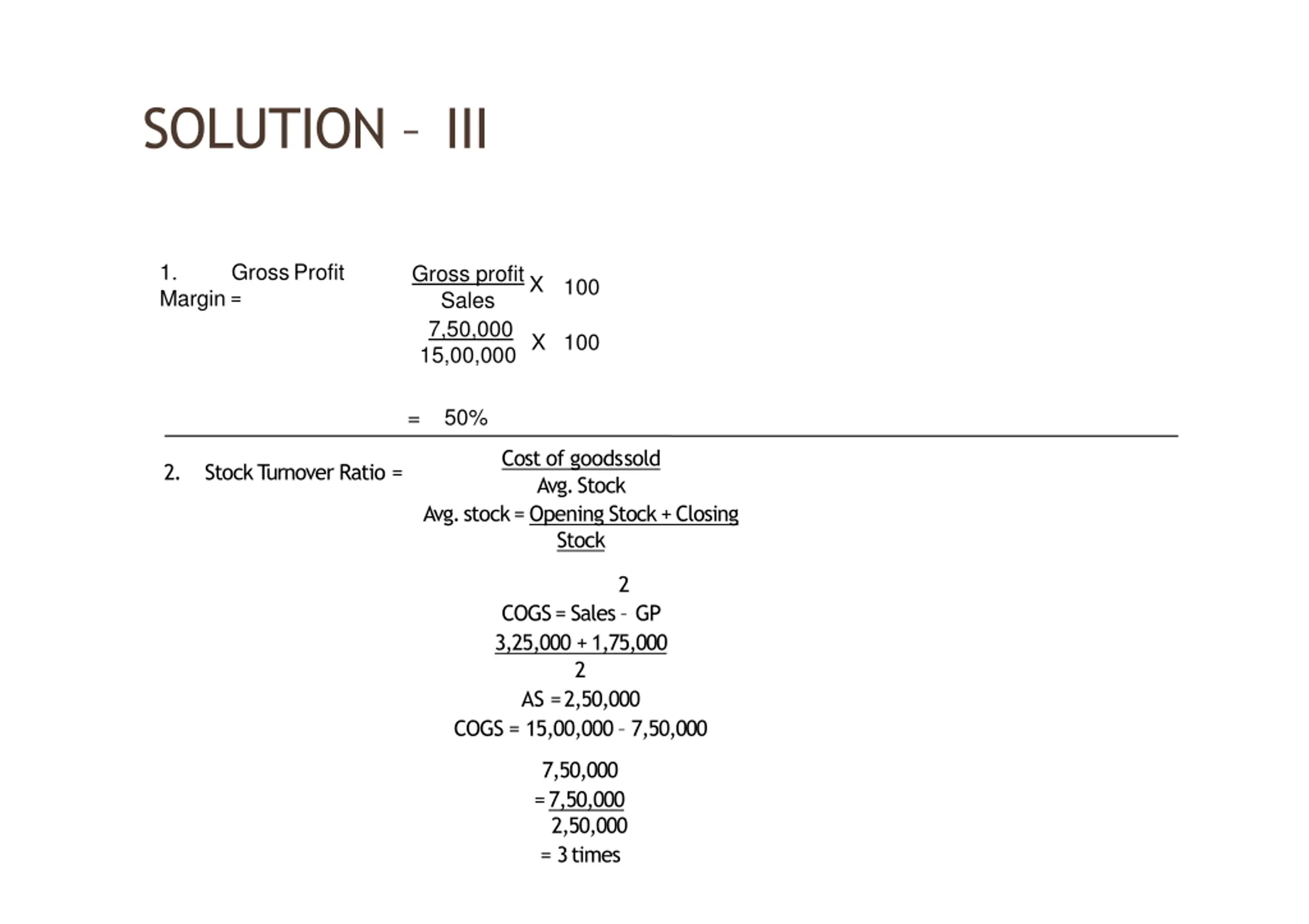 SOLUTION III 1. Margin = GrossProfit Gross profitX 100 Sales 7,50,000 15,00,000 X 100 = 50% Cost of goodssold Avg.Stock Avg.stock=OpeningStock+Closing Stock 2. Stock Turnover Ratio = 2 COGS=Sales GP 3,25,000 +1,75,000 2 AS =2,50,000 COGS = 15,00,000 7,50,000 7,50,000 =7,50,000 2,50,000 = 3times