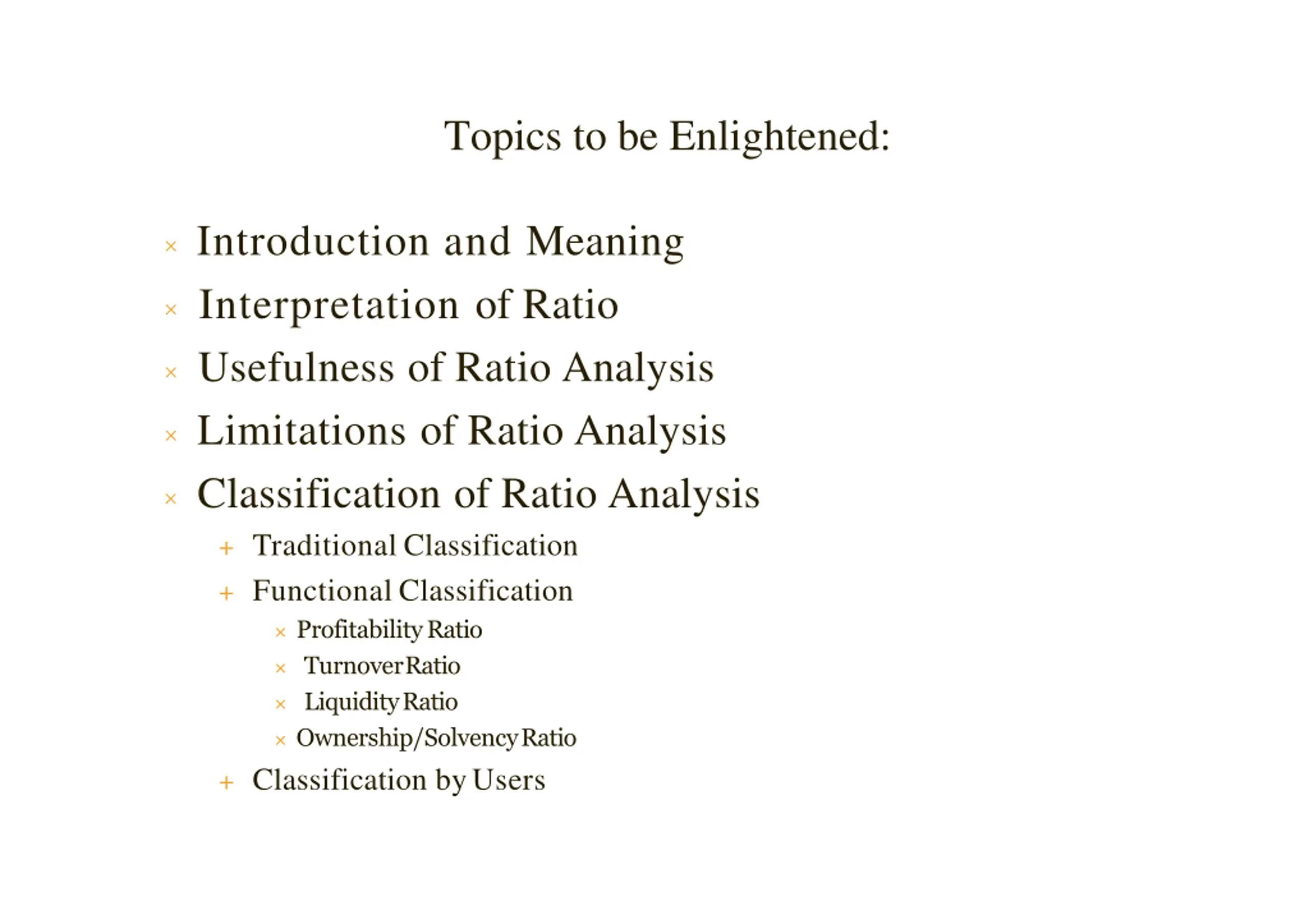 Topics to be Enlightened: Introduction and Meaning Interpretation of Ratio Usefulness of Ratio Analysis Limitations of Ratio Analysis Classification of Ratio Analysis + Traditional Classification + Functional Classification ProfitabilityRatio TurnoverRatio LiquidityRatio Ownership/SolvencyRatio + Classification byUsers