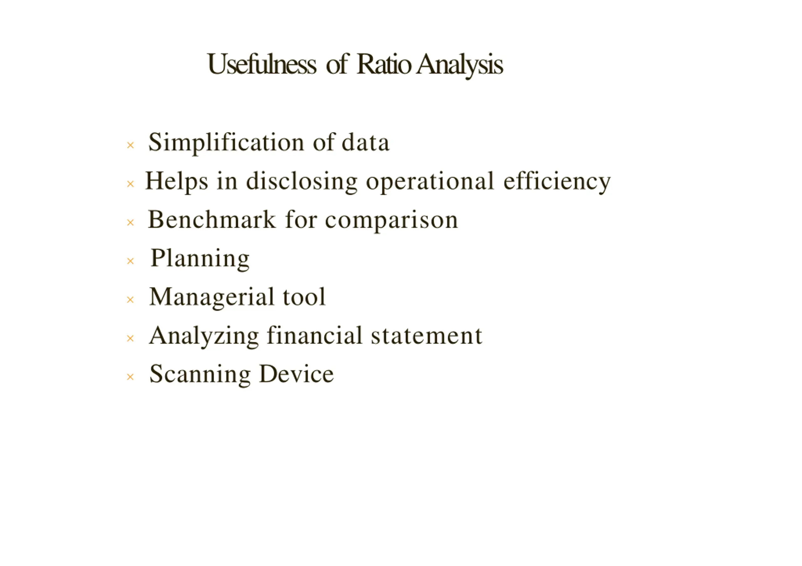 Usefulness of Ratio Analysis Simplification of data Helps in disclosing operational efficiency Benchmark for comparison Planning Managerial tool Analyzing financial statement Scanning Device
