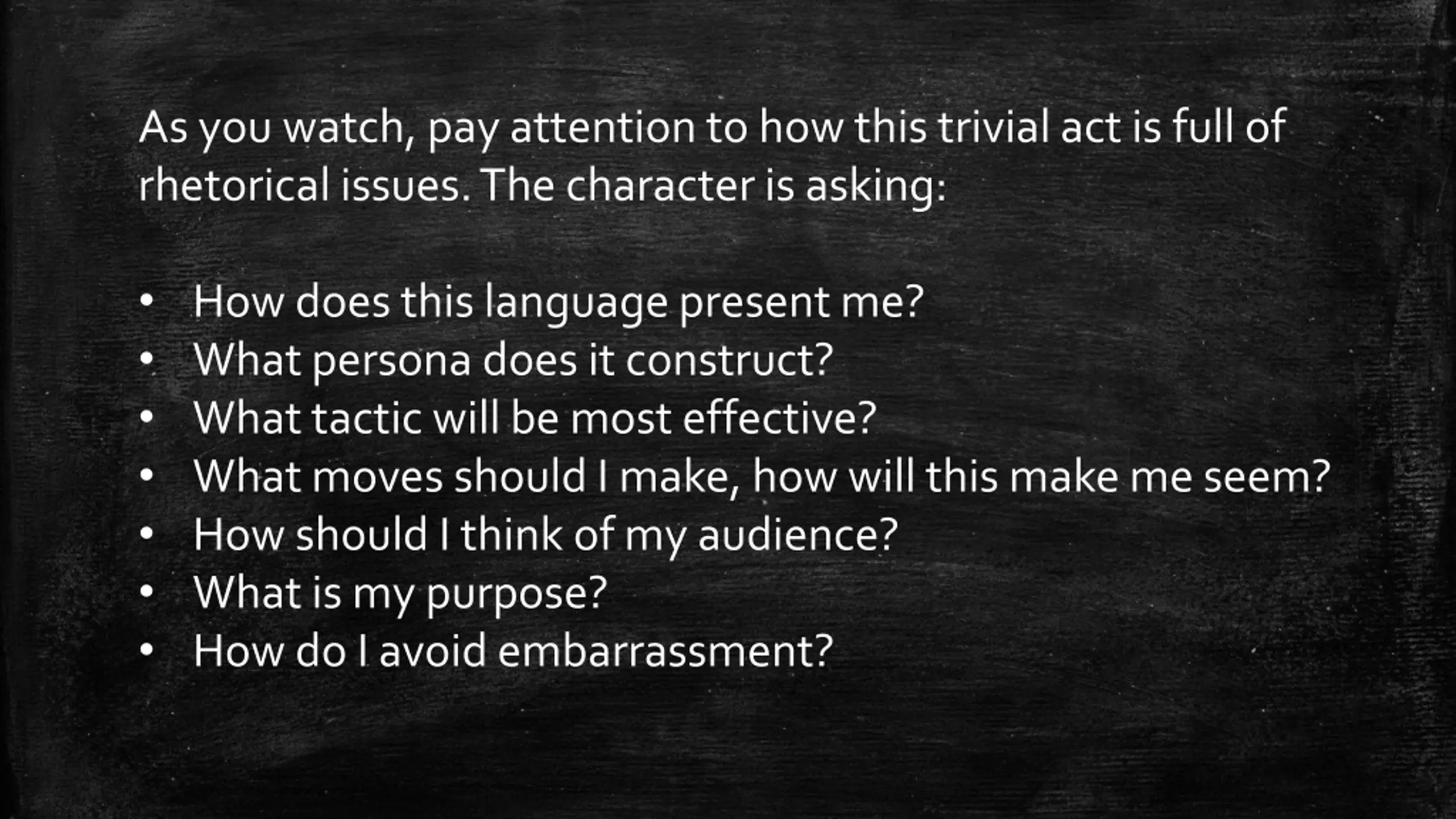 As you watch, pay attention to how this trivial act is full of rhetorical issues. The character is asking: How does this language present me? What persona does it construct? What tactic will be most effective? What moves should I make, how will this make me seem? How should I think of my audience? What is my purpose? How do I avoid embarrassment?