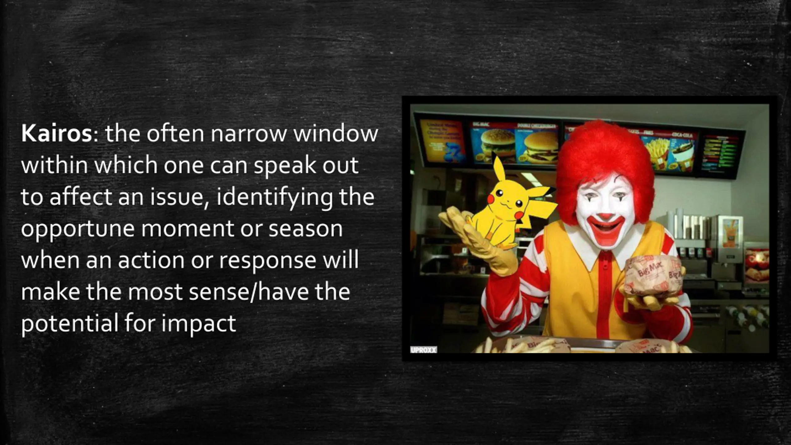 Kairos: the often narrow window within which one can speak out to affect an issue, identifying the opportune moment or season when an action or response will make the most sense/have the potential for impact