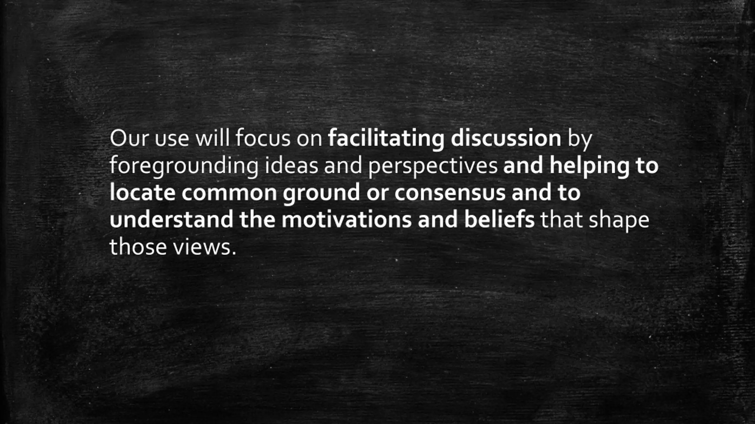 Our use will focus on facilitating discussion by foregrounding ideas and perspectives and helping to locate common ground or consensus and to understand the motivations and beliefs that shape those views.