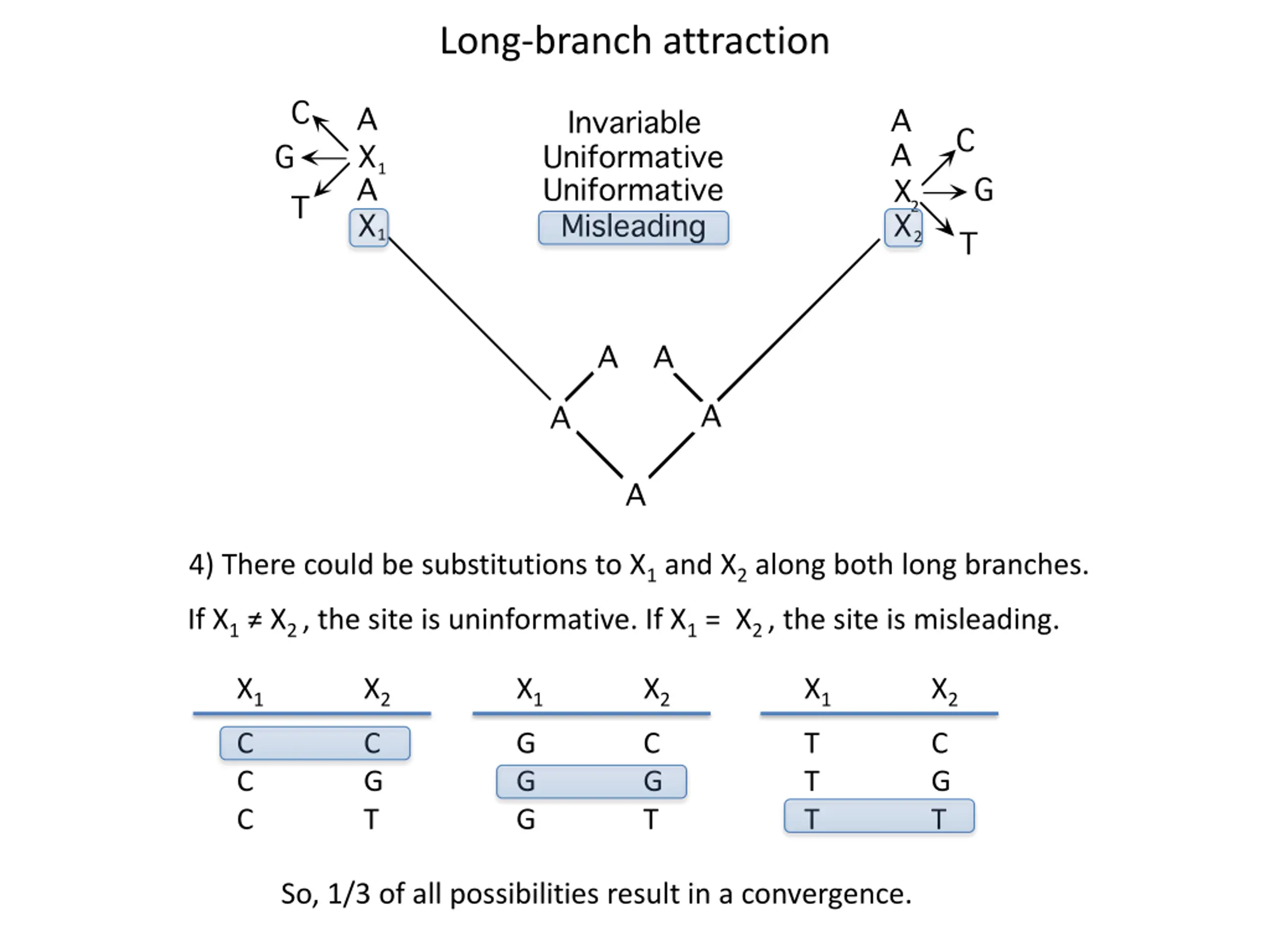 Long-branch attraction 1 2 1 2 4) There could be substitutions to X1 and X2 along both long branches. If X1 X2 , the site is uninformative. If X1 = X2 , the site is misleading. X1 X2 X1 X2 X1 X2 C C C C G T G G G C G T T T T C G T So, 1/3 of all possibilities result in a convergence.