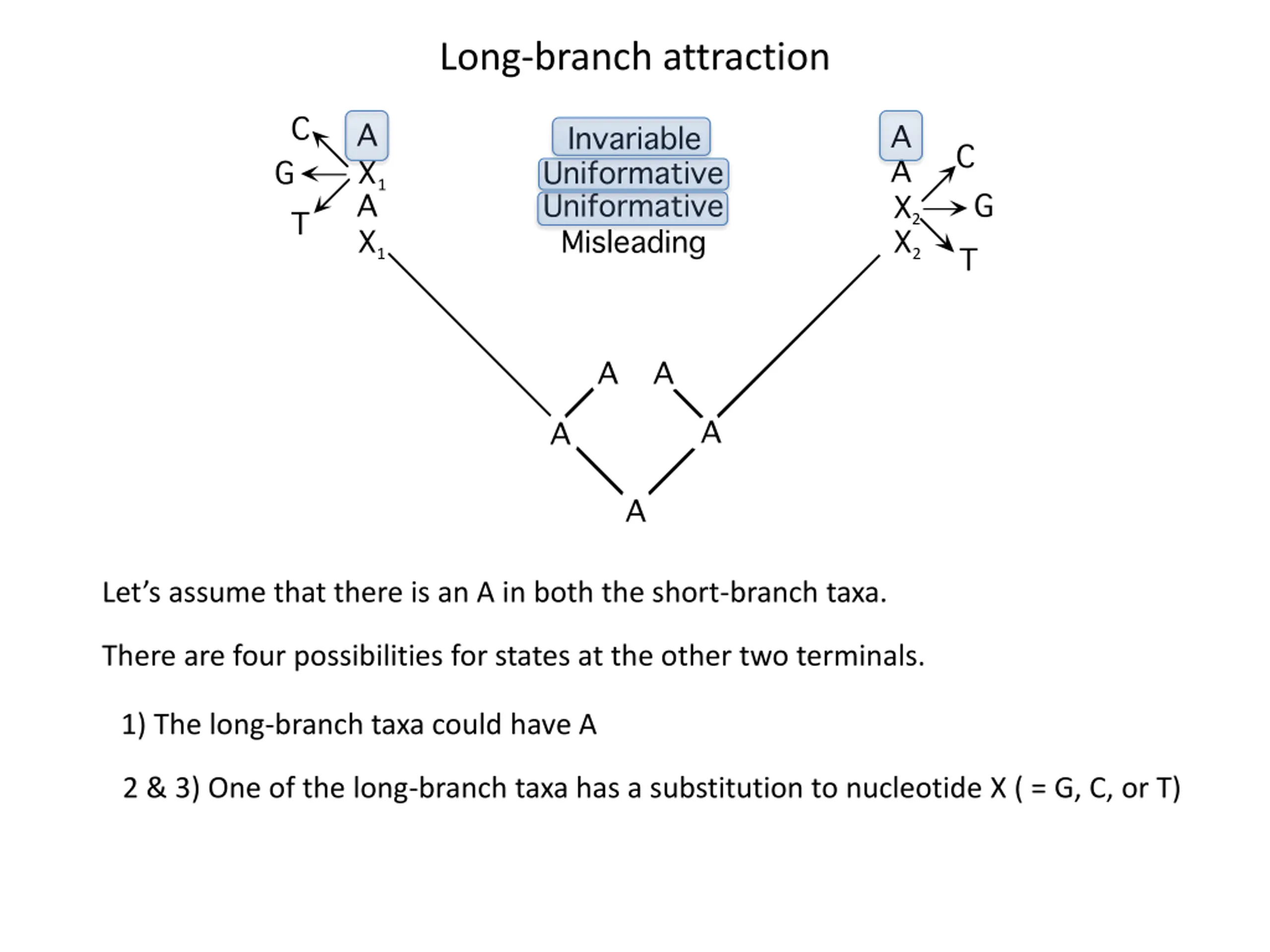 Long-branch attraction 1 2 1 2 Let s assume that there is an A in both the short-branch taxa. There are four possibilities for states at the other two terminals. 1) The long-branch taxa could have A 2 & 3) One of the long-branch taxa has a substitution to nucleotide X ( = G, C, or T)