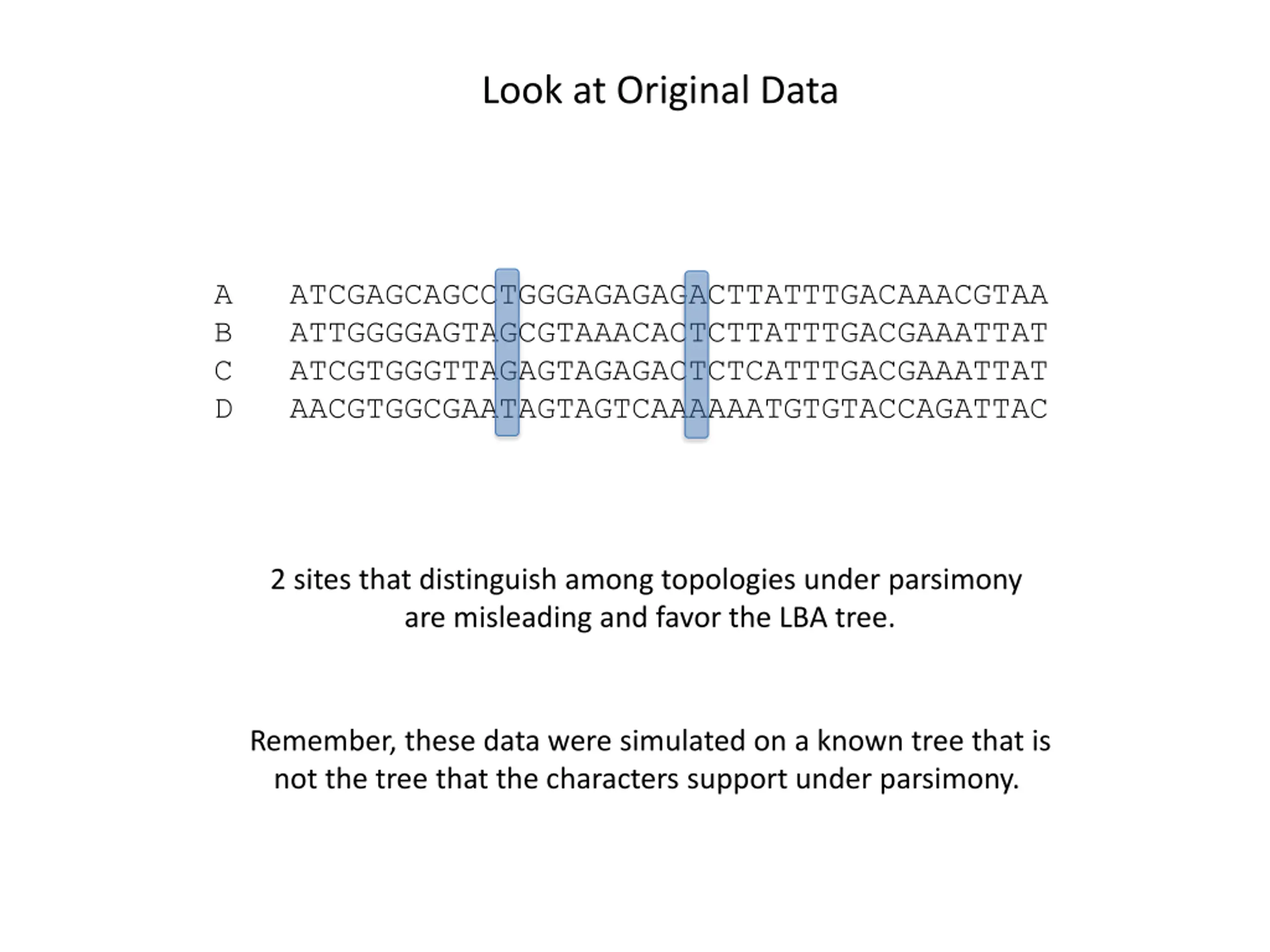 Look at Original Data A ATCGAGCAGCCTGGGAGAGAGACTTATTTGACAAACGTAA B ATTGGGGAGTAGCGTAAACACTCTTATTTGACGAAATTAT C ATCGTGGGTTAGAGTAGAGACTCTCATTTGACGAAATTAT D AACGTGGCGAATAGTAGTCAAAAAATGTGTACCAGATTAC 2 sites that distinguish among topologies under parsimony are misleading and favor the LBA tree. Remember, these data were simulated on a known tree that is not the tree that the characters support under parsimony.
