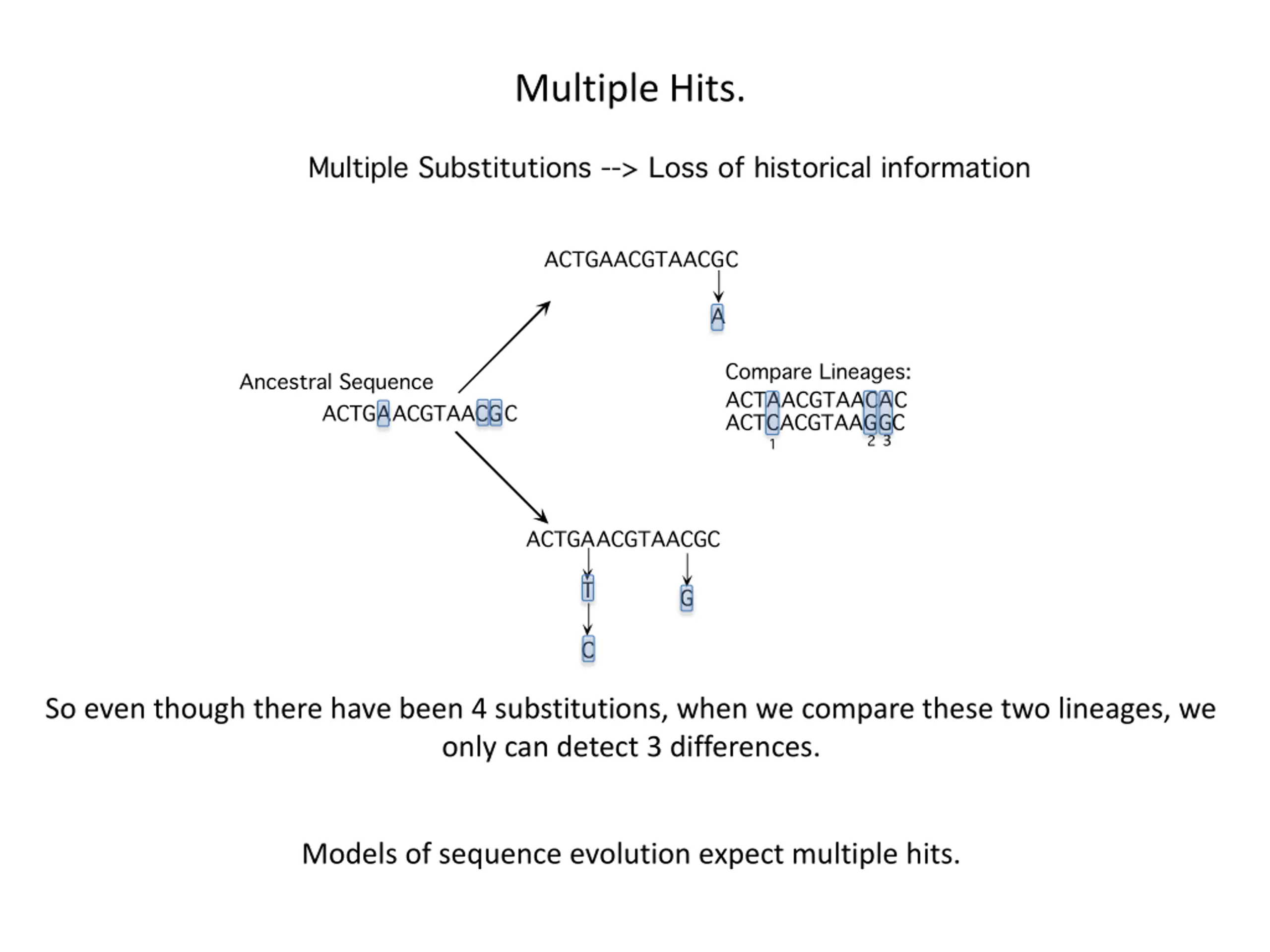 Multiple Hits. 3 So even though there have been 4 substitutions, when we compare these two lineages, we only can detect 3 differences. Models of sequence evolution expect multiple hits.