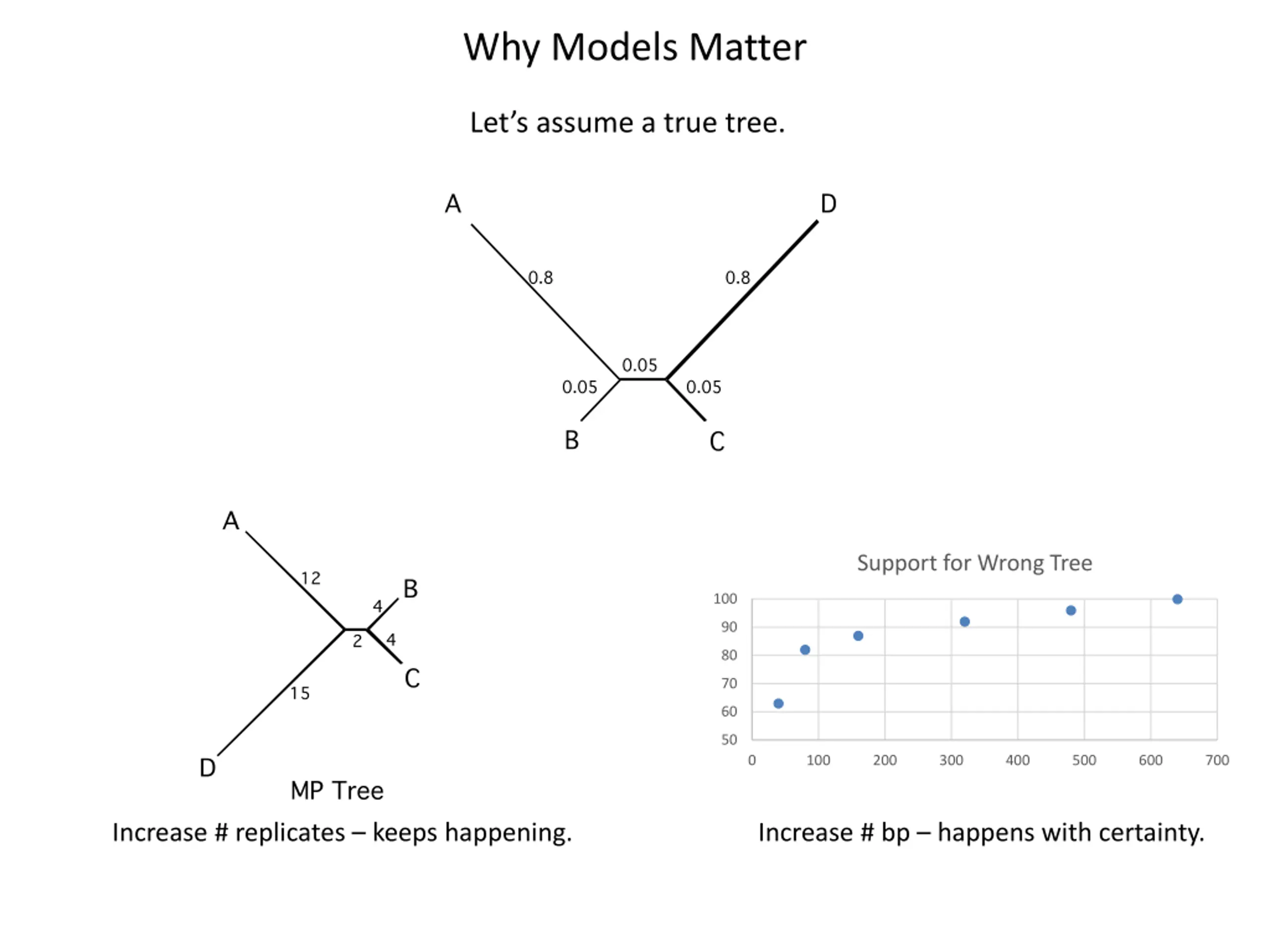 Why Models Matter Let s assume a true tree. Support for Wrong Tree 100 90 80 70 60 50 0 100 200 300 400 500 600 700 Increase # replicates keeps happening. Increase # bp happens with certainty.