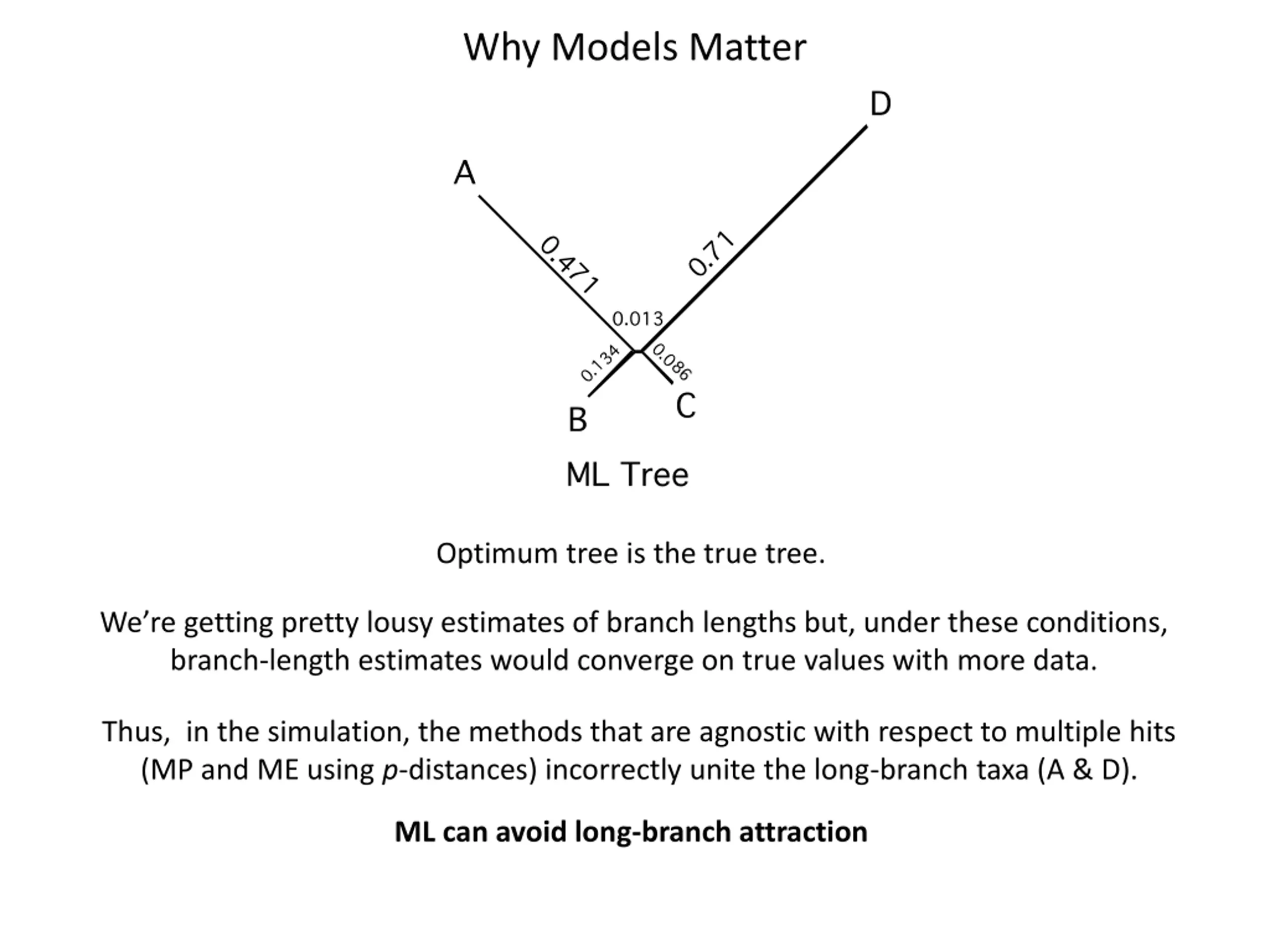 Why Models Matter Optimum tree is the true tree. We re getting pretty lousy estimates of branch lengths but, under these conditions, branch-length estimates would converge on true values with more data. Thus, in the simulation, the methods that are agnostic with respect to multiple hits (MP and ME using p-distances) incorrectly unite the long-branch taxa (A & D). ML can avoid long-branch attraction