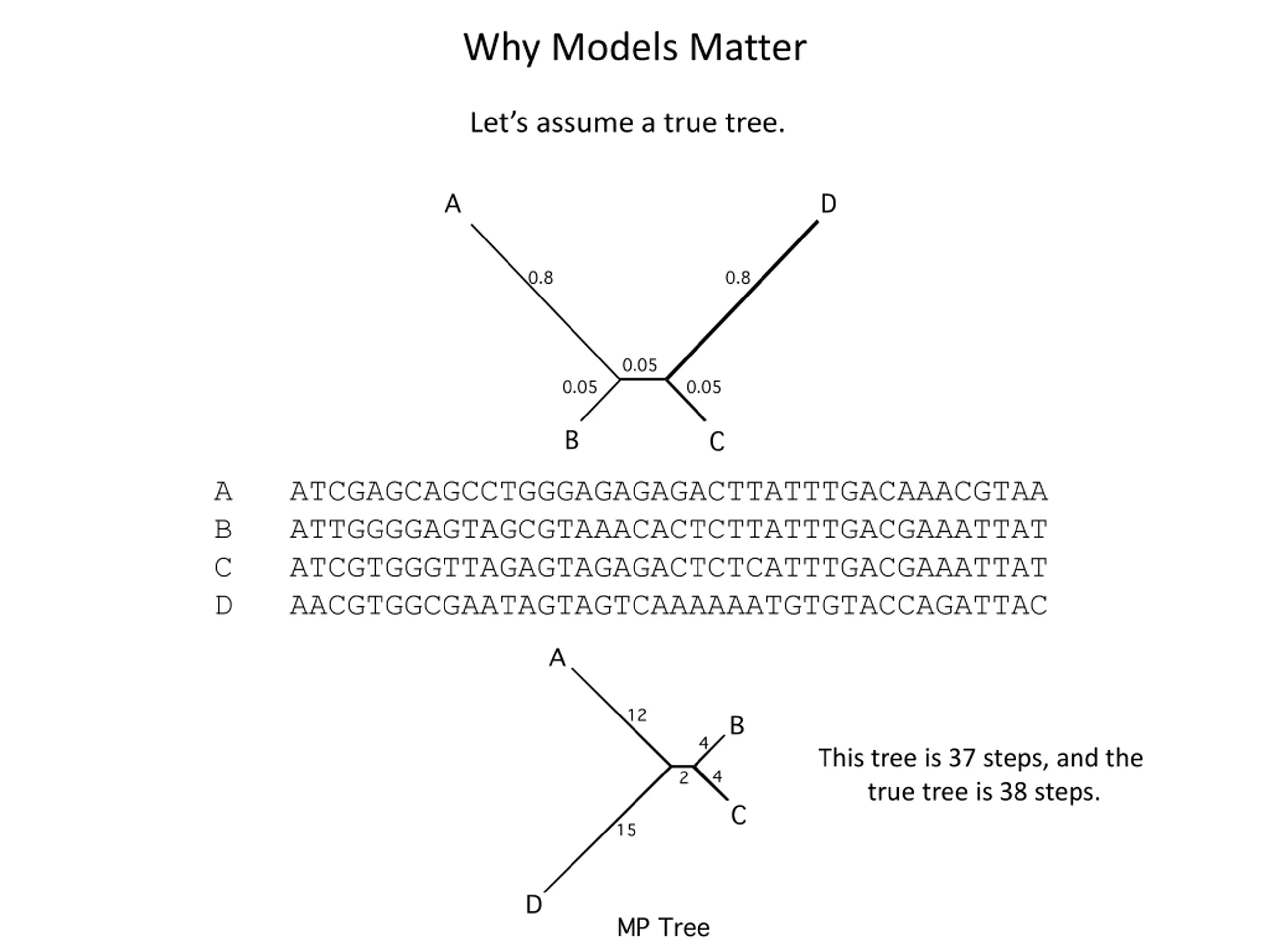 Why Models Matter Let s assume a true tree. A ATCGAGCAGCCTGGGAGAGAGACTTATTTGACAAACGTAA B ATTGGGGAGTAGCGTAAACACTCTTATTTGACGAAATTAT C ATCGTGGGTTAGAGTAGAGACTCTCATTTGACGAAATTAT D AACGTGGCGAATAGTAGTCAAAAAATGTGTACCAGATTAC This tree is 37 steps, and the true tree is 38 steps.