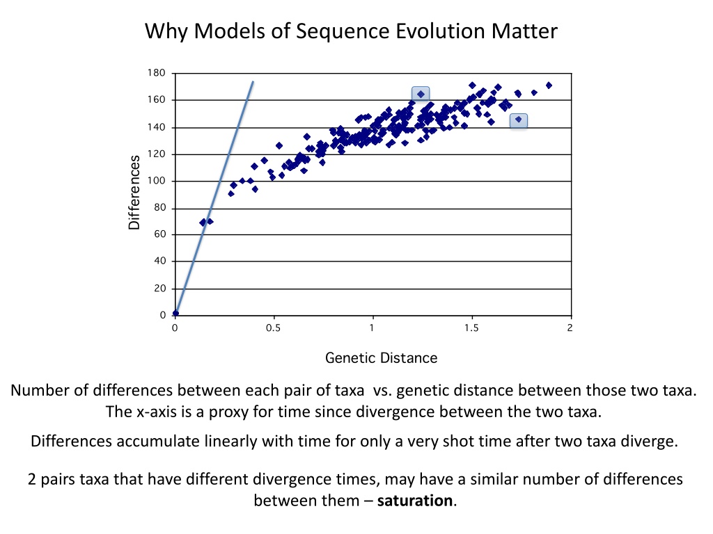 Why Models of Sequence Evolution Matter Number of differences between each pair of taxa vs. genetic distance between those two taxa. The x-axis is a proxy for time since divergence between the two taxa. Differences accumulate linearly with time for only a very shot time after two taxa diverge. 2 pairs taxa that have different divergence times, may have a similar number of differences between them saturation.