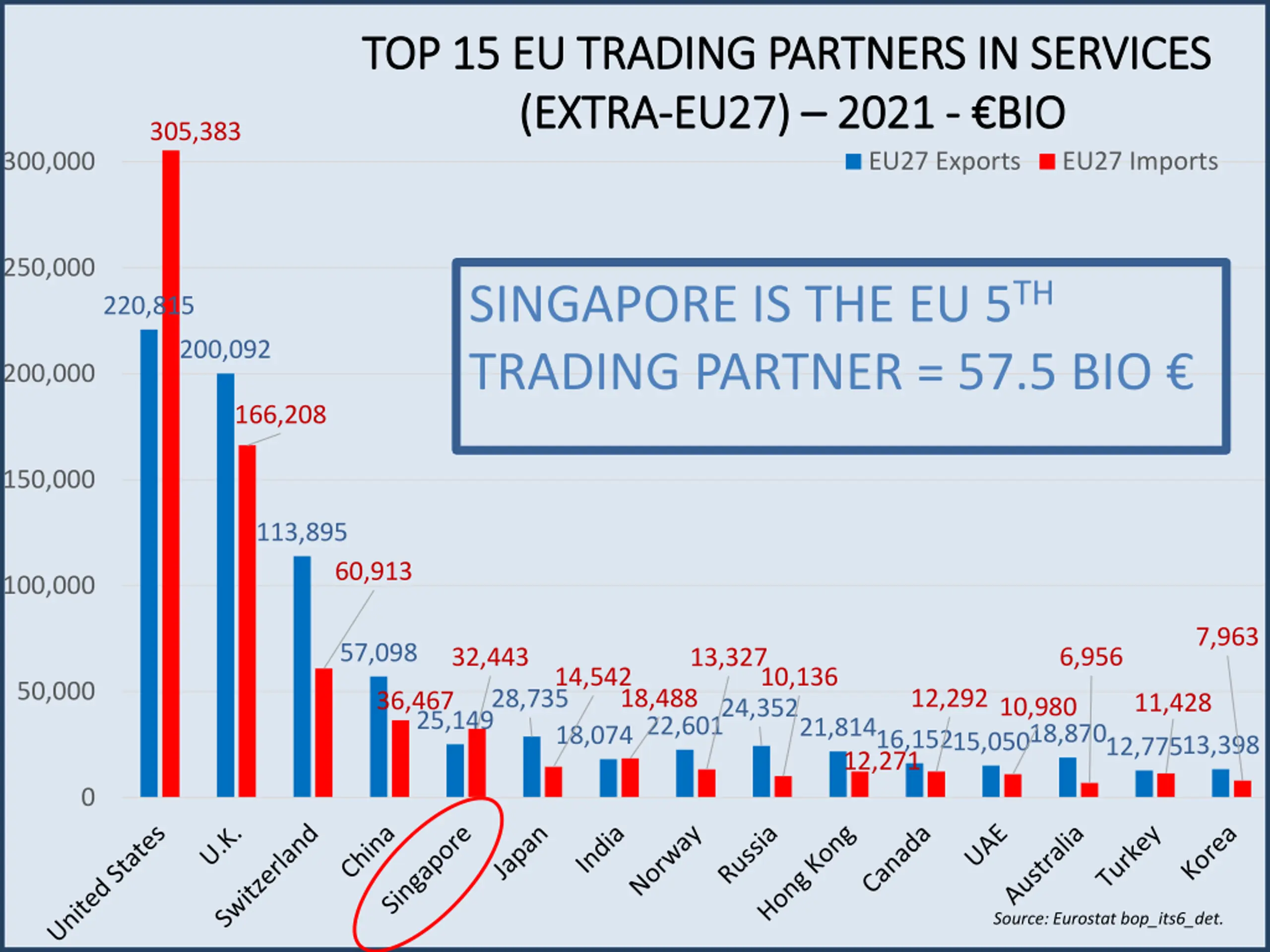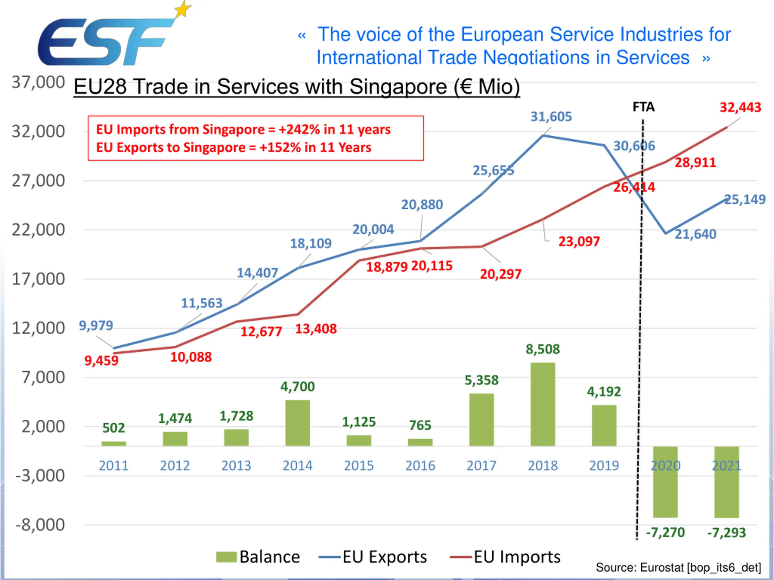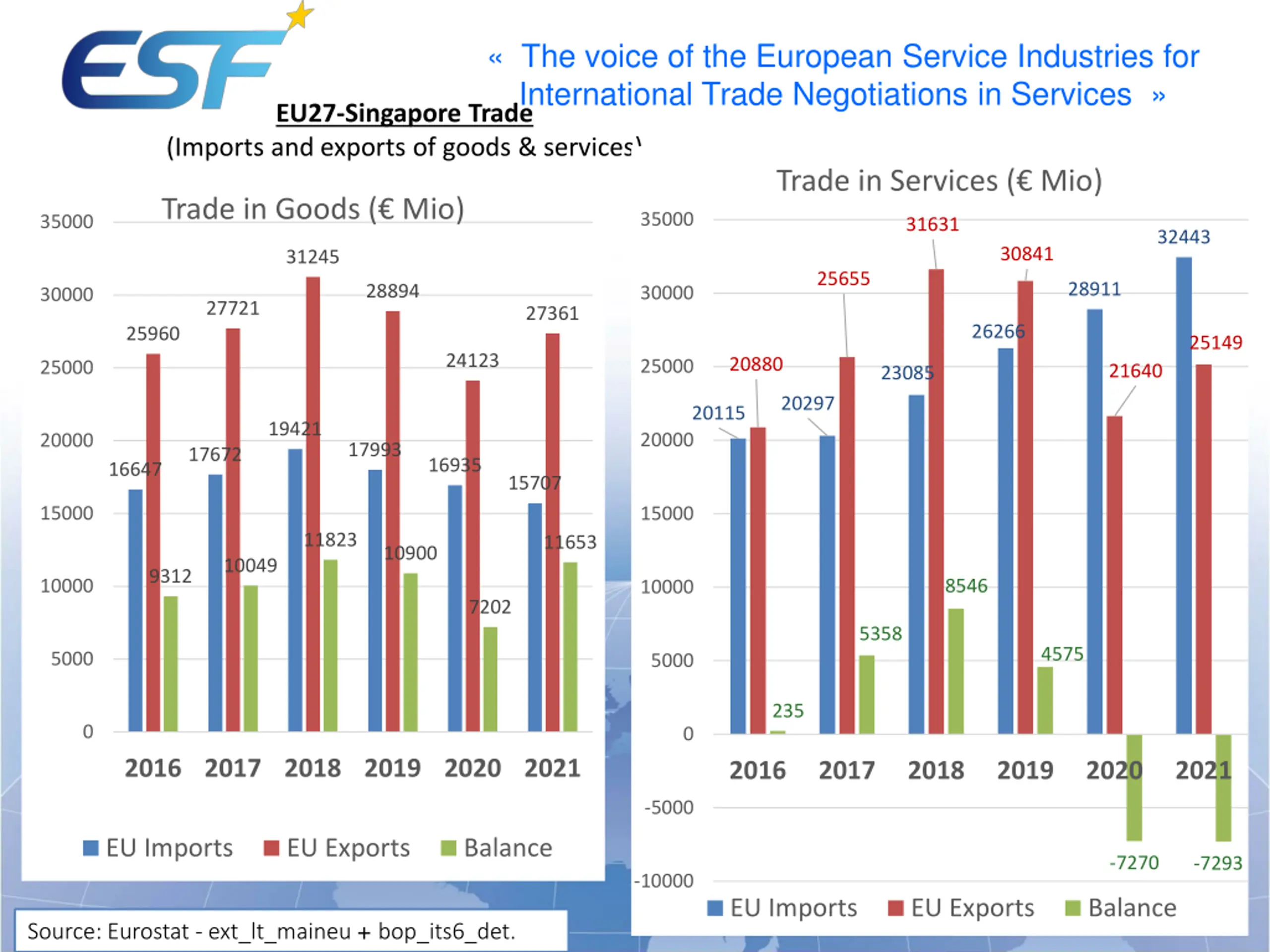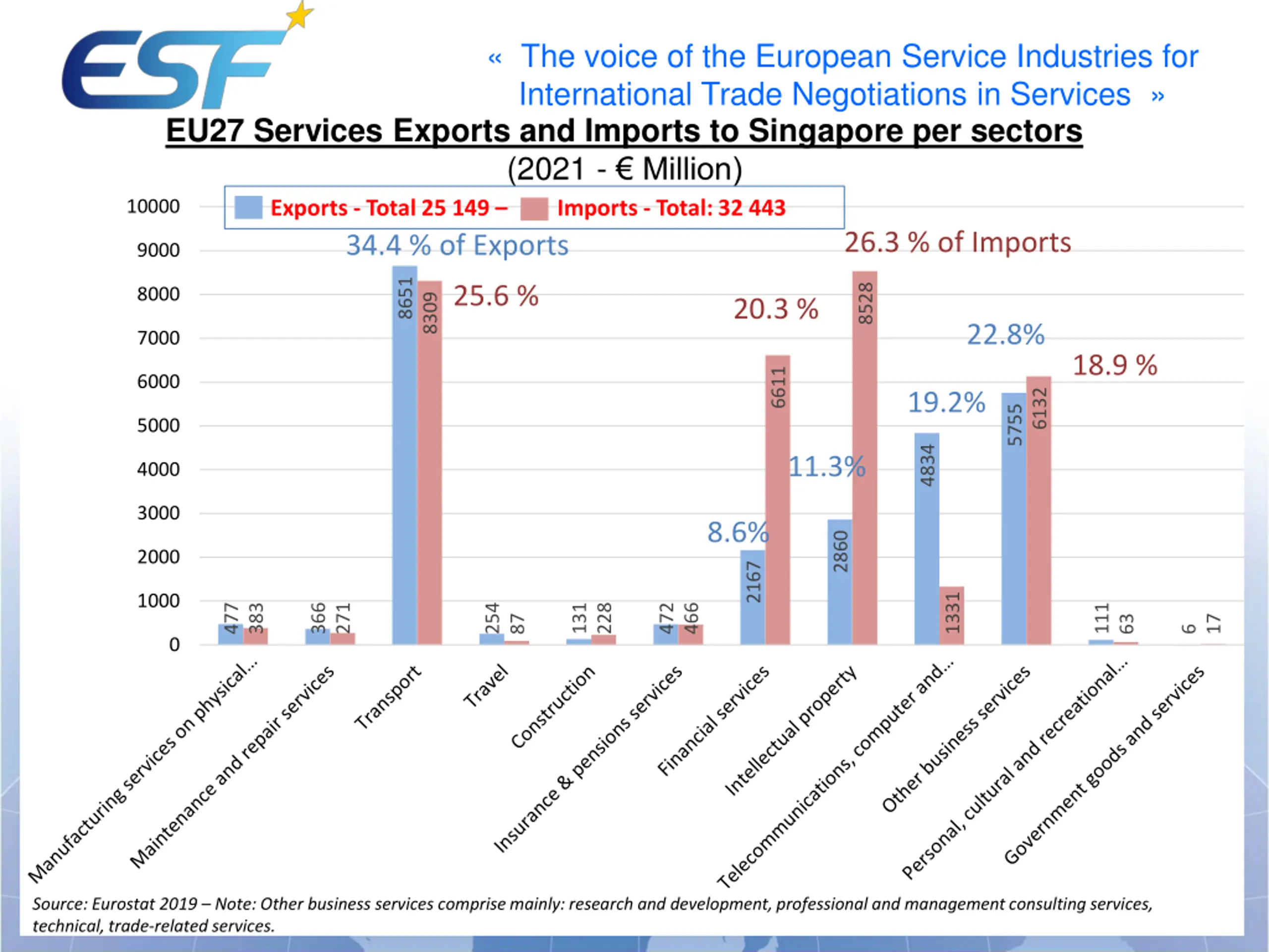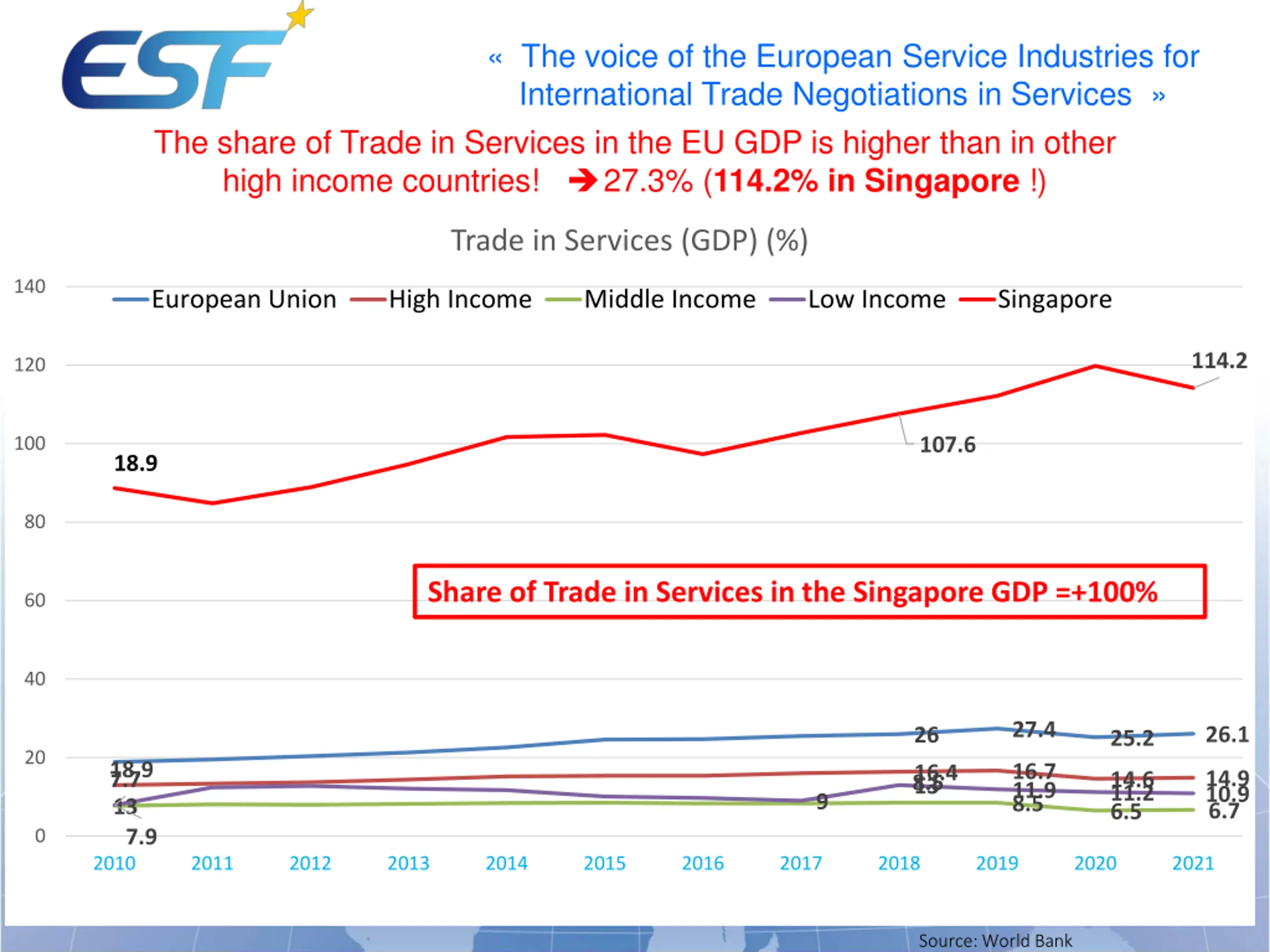 The voice of the European Service Industries for International Trade Negotiations in Services IMPORTANCE OF TRADE IN SERVICES in Singapore Comparison between BoP & TiVA Singapore Exports in TiVA - 2016 - % Singapore global Exports in BOP - 2021 US$ - Bio - 33.5% 66.5% 30.1 230 69.9 457 Goods Services Goods Services Total Export Singapore = 687 $ Bio TiVA: Trade in Value Added - OECD Source: WTO WTS2021 & TiVA