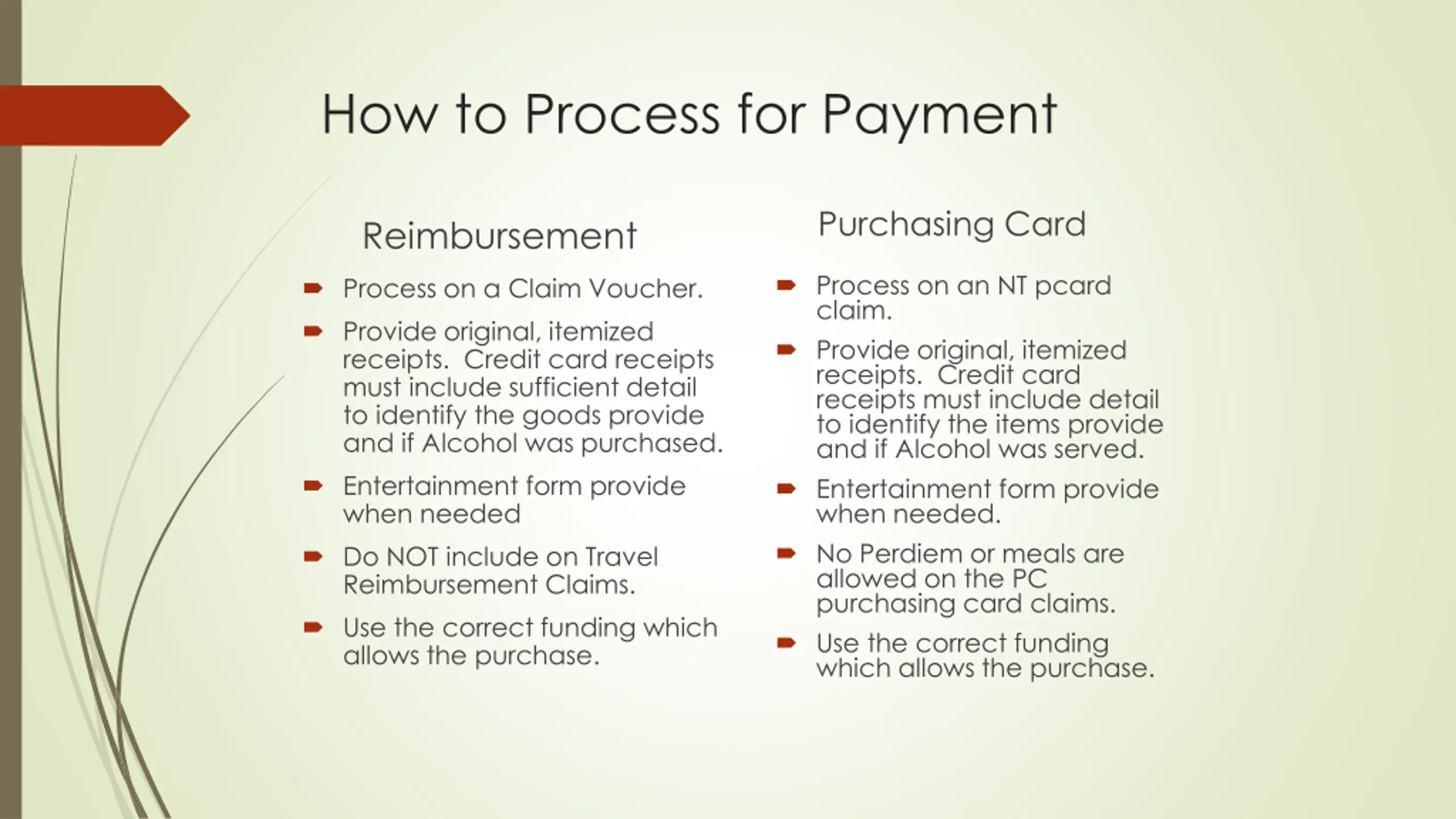 How to Process for Payment Purchasing Card Reimbursement Process on an NT pcard claim. Provide original, itemized receipts. Credit card receipts must include detail to identify the items provide and if Alcohol was served. Entertainment form provide when needed. No Perdiem or meals are allowed on the PC purchasing card claims. Use the correct funding which allows the purchase. Process on a Claim Voucher. Provide original, itemized receipts. Credit card receipts must include sufficient detail to identify the goods provide and if Alcohol was purchased. Entertainment form provide when needed Do NOT include on Travel Reimbursement Claims. Use the correct funding which allows the purchase.