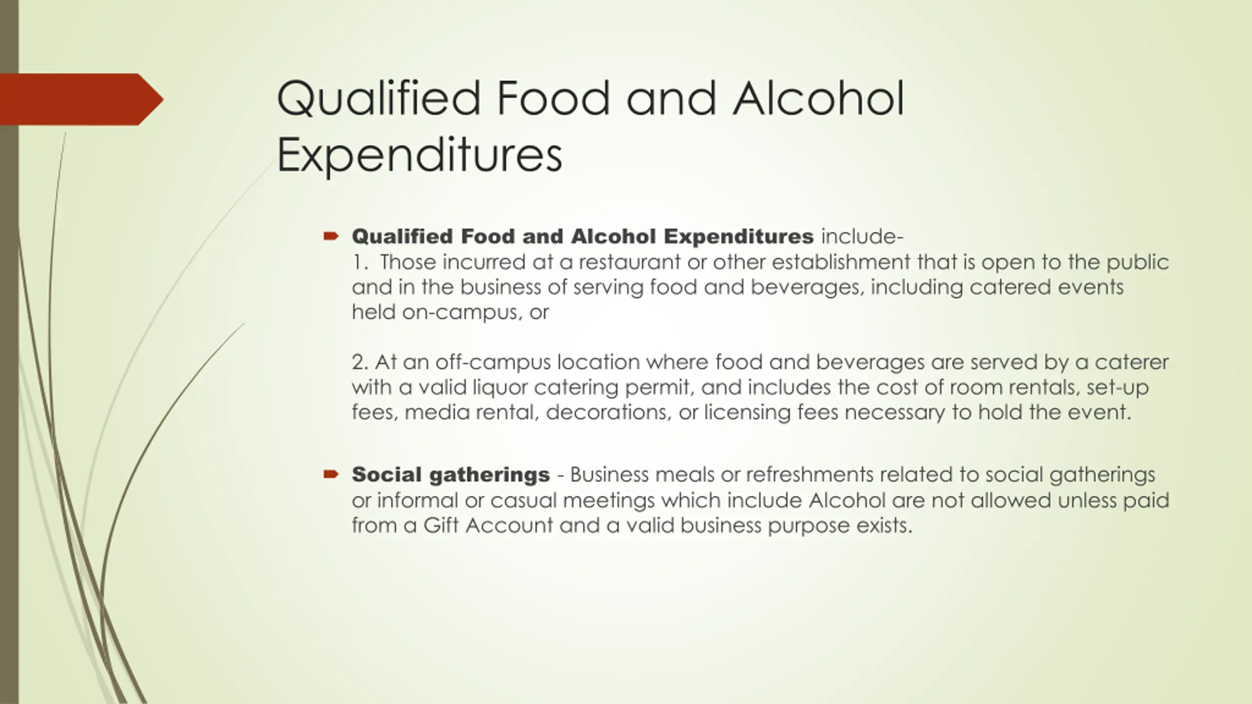 Qualified Food and Alcohol Expenditures Qualified Food and Alcohol Expenditures include- 1. Those incurred at a restaurant or other establishment that is open to the public and in the business of serving food and beverages, including catered events held on-campus, or 2. At an off-campus location where food and beverages are served by a caterer with a valid liquor catering permit, and includes the cost of room rentals, set-up fees, media rental, decorations, or licensing fees necessary to hold the event. Social gatherings - Business meals or refreshments related to social gatherings or informal or casual meetings which include Alcohol are not allowed unless paid from a Gift Account and a valid business purpose exists.