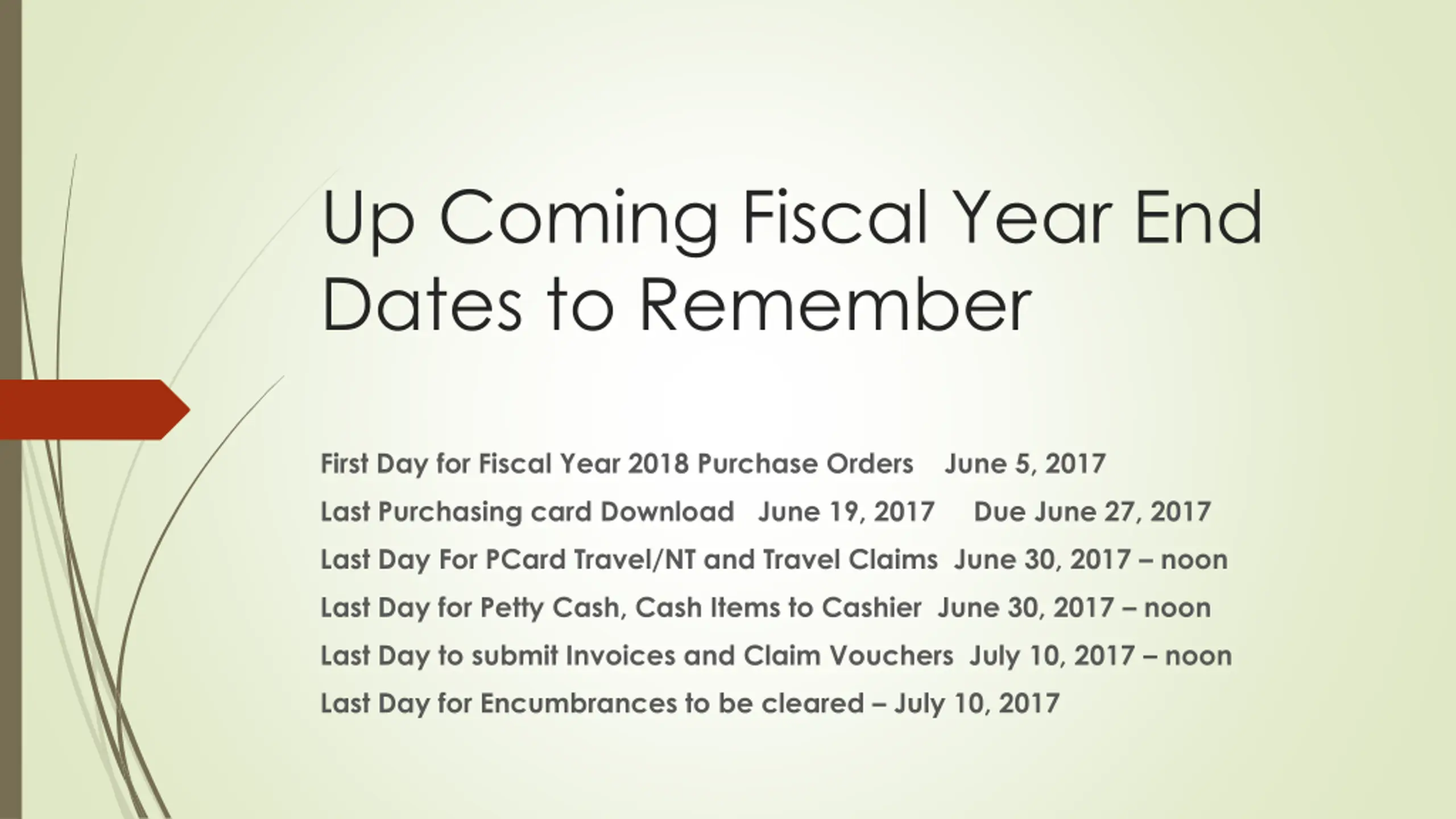 Up Coming Fiscal Year End Dates to Remember First Day for Fiscal Year 2018 Purchase Orders June 5, 2017 Last Purchasing card Download June 19, 2017 Due June 27, 2017 Last Day For PCard Travel/NT and Travel Claims June 30, 2017 noon Last Day for Petty Cash, Cash Items to Cashier June 30, 2017 noon Last Day to submit Invoices and Claim Vouchers July 10, 2017 noon Last Day for Encumbrances to be cleared July 10, 2017