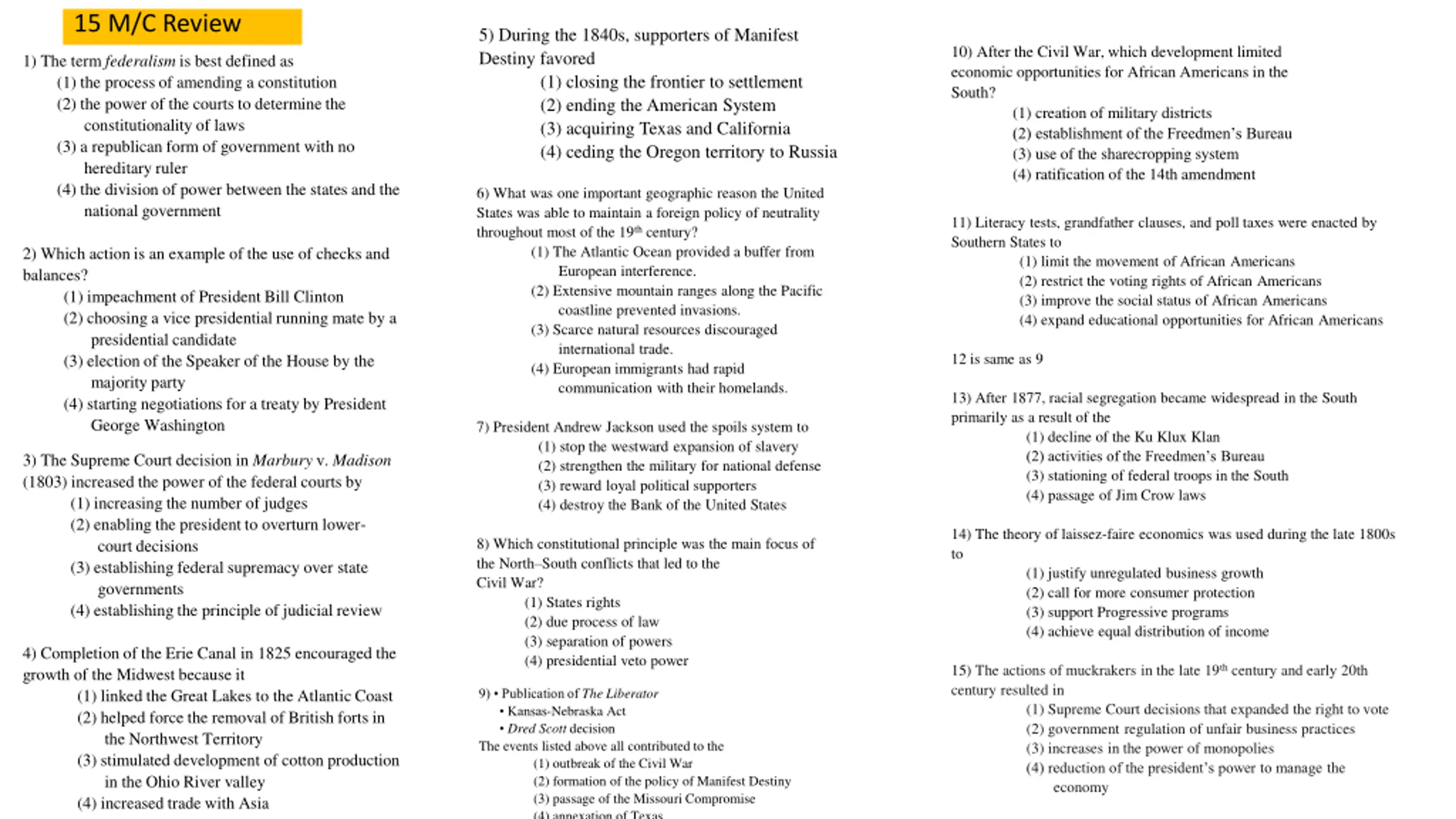15 M/C Review 5) During the 1840s, supporters of Manifest Destiny favored (1) closing the frontier to settlement (2) ending the American System (3) acquiring Texas and California (4) ceding the Oregon territory to Russia 10) After the Civil War, which development limited economic opportunities for African Americans in the South? (1) creation of military districts (2) establishment of the Freedmen s Bureau (3) use of the sharecropping system (4) ratification of the 14th amendment 1) The term federalism is best defined as (1) the process of amending a constitution (2) the power of the courts to determine the constitutionality of laws (3) a republican form of government with no hereditary ruler (4) the division of power between the states and the national government 6) What was one important geographic reason the United States was able to maintain a foreign policy of neutrality throughout most of the 19th century? (1) The Atlantic Ocean provided a buffer from European interference. (2) Extensive mountain ranges along the Pacific coastline prevented invasions. (3) Scarce natural resources discouraged international trade. (4) European immigrants had rapid communication with their homelands. 11) Literacy tests, grandfather clauses, and poll taxes were enacted by Southern States to (1) limit the movement of African Americans (2) restrict the voting rights of African Americans (3) improve the social status of African Americans (4) expand educational opportunities for African Americans 2) Which action is an example of the use of checks and balances? (1) impeachment of President Bill Clinton (2) choosing a vice presidential running mate by a presidential candidate (3) election of the Speaker of the House by the majority party (4) starting negotiations for a treaty by President George Washington 12 is same as 9 13) After 1877, racial segregation became widespread in the South primarily as a result of the (1) decline of the Ku Klux Klan (2) activities of the Freedmen s Bureau (3) stationing of federal troops in the South (4) passage of Jim Crow laws 7) President Andrew Jackson used the spoils system to (1) stop the westward expansion of slavery (2) strengthen the military for national defense (3) reward loyal political supporters (4) destroy the Bank of the United States 3) The Supreme Court decision in Marbury v. Madison (1803) increased the power of the federal courts by (1) increasing the number of judges (2) enabling the president to overturn lower- court decisions (3) establishing federal supremacy over state governments (4) establishing the principle of judicial review 14) The theory of laissez-faire economics was used during the late 1800s to (1) justify unregulated business growth (2) call for more consumer protection (3) support Progressive programs (4) achieve equal distribution of income 8) Which constitutional principle was the main focus of the North South conflicts that led to the Civil War? (1) States rights (2) due process of law (3) separation of powers (4) presidential veto power 4) Completion of the Erie Canal in 1825 encouraged the growth of the Midwest because it (1) linked the Great Lakes to the Atlantic Coast (2) helped force the removal of British forts in the Northwest Territory (3) stimulated development of cotton production in the Ohio River valley (4) increased trade with Asia 15) The actions of muckrakers in the late 19th century and early 20th century resulted in (1) Supreme Court decisions that expanded the right to vote (2) government regulation of unfair business practices (3) increases in the power of monopolies (4) reduction of the president s power to manage the economy 9) Publication of The Liberator Kansas-Nebraska Act Dred Scott decision The events listed above all contributed to the (1) outbreak of the Civil War (2) formation of the policy of Manifest Destiny (3) passage of the Missouri Compromise (4) annexation of Texas
