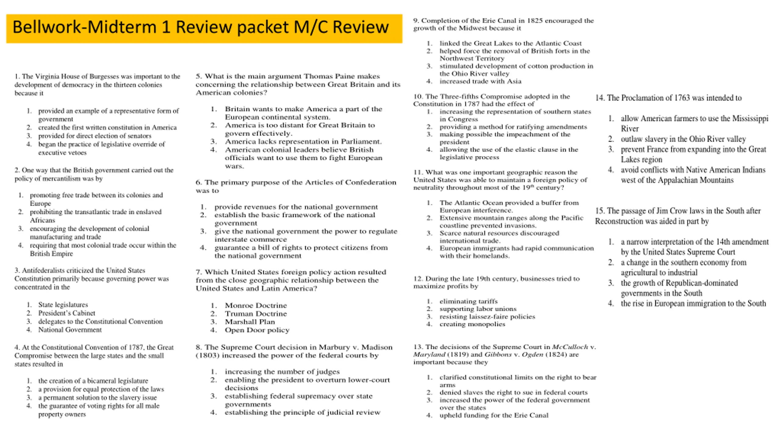 9. Completion of the Erie Canal in 1825 encouraged the growth of the Midwest because it 1.linked the Great Lakes to the Atlantic Coast 2.helped force the removal of British forts in the Northwest Territory 3.stimulated development of cotton production in the Ohio River valley 4.increased trade with Asia 10. The Three-fifths Compromise adopted in the Constitution in 1787 had the effect of 1.increasing the representation of southern states in Congress 2.providing a method for ratifying amendments 3.making possible the impeachment of the president 4.allowing the use of the elastic clause in the legislative process 11. What was one important geographic reason the United States was able to maintain a foreign policy of neutrality throughout most of the 19th century? 1.The Atlantic Ocean provided a buffer from European interference. 2.Extensive mountain ranges along the Pacific coastline prevented invasions. 3.Scarce natural resources discouraged international trade. 4.European immigrants had rapid communication with their homelands. 12. During the late 19th century, businesses tried to maximize profits by 1.eliminating tariffs 2.supporting labor unions 3.resisting laissez-faire policies 4.creating monopolies 13. The decisions of the Supreme Court in McCulloch v. Maryland (1819) and Gibbons v. Ogden (1824)are important because they 1.clarified constitutional limits on the right to bear arms 2.denied slaves the right to sue in federal courts 3.increased the power of the federal government over the states 4.upheld funding for the Erie Canal Bellwork-Midterm 1 Review packet M/C Review 1. The Virginia House of Burgesses was important to the development of democracy in the thirteen colonies because it 5. What is the main argument Thomas Paine makes concerning the relationship between Great Britain and its American colonies? 1.Britain wants to make America a part of the European continental system. 2.America is too distant for Great Britain to govern effectively. 3.America lacks representation in Parliament. 4.American colonial leaders believe British officials want to use them to fight European wars. 6. The primary purpose of the Articles of Confederation was to 1.provide revenues for the national government 2.establish the basic framework of the national government 3.give the national government the power to regulate interstate commerce 4.guarantee a bill of rights to protect citizens from the national government 7. Which United States foreign policy action resulted from the close geographic relationship between the United States and Latin America? 14. The Proclamation of 1763 was intended to 1.allow American farmers to use the Mississippi River 2.outlaw slavery in the Ohio River valley 3.prevent France from expanding into the Great Lakes region 4.avoid conflicts with Native American Indians west of the Appalachian Mountains 15. The passage of Jim Crow laws in the South after Reconstruction was aided in part by 1.a narrow interpretation of the 14th amendment by the United States Supreme Court 2.a change in the southern economy from agricultural to industrial 3.the growth of Republican-dominated governments in the South 4.the rise in European immigration to the South 1.provided an example of a representative form of government 2.created the first written constitution in America 3.provided for direct election of senators 4.began the practice of legislative override of executive vetoes 2. One way that the British government carried out the policy of mercantilism was by 1.promoting free trade between its colonies and Europe 2.prohibiting the transatlantic trade in enslaved Africans 3.encouraging the development of colonial manufacturing and trade 4.requiring that most colonial trade occur within the British Empire 3. Antifederalists criticized the United States Constitution primarily because governing power was concentrated in the 1.State legislatures 2.President s Cabinet 3.delegates to the Constitutional Convention 4.National Government 1.Monroe Doctrine 2.Truman Doctrine 3.Marshall Plan 4.Open Door policy 8. The Supreme Court decision in Marbury v. Madison (1803) increased the power of the federal courts by 1.increasing the number of judges 2.enabling the president to overturn lower-court decisions 3.establishing federal supremacy over state governments 4.establishing the principle of judicial review 4. At the Constitutional Convention of 1787, the Great Compromise between the large states and the small states resulted in 1.the creation of a bicameral legislature 2.a provision for equal protection of the laws 3.a permanent solution to the slavery issue 4.the guarantee of voting rights for all male property owners