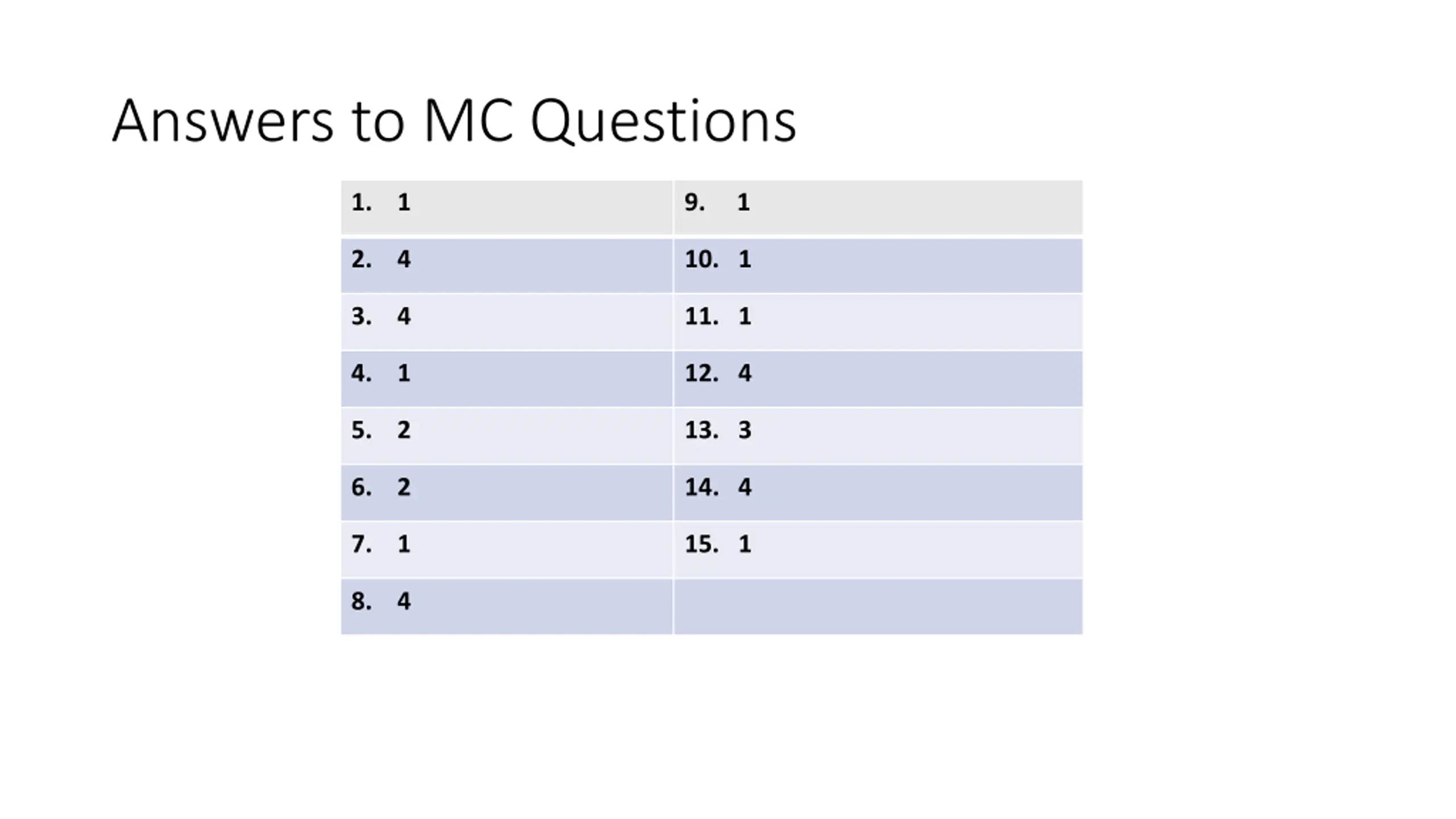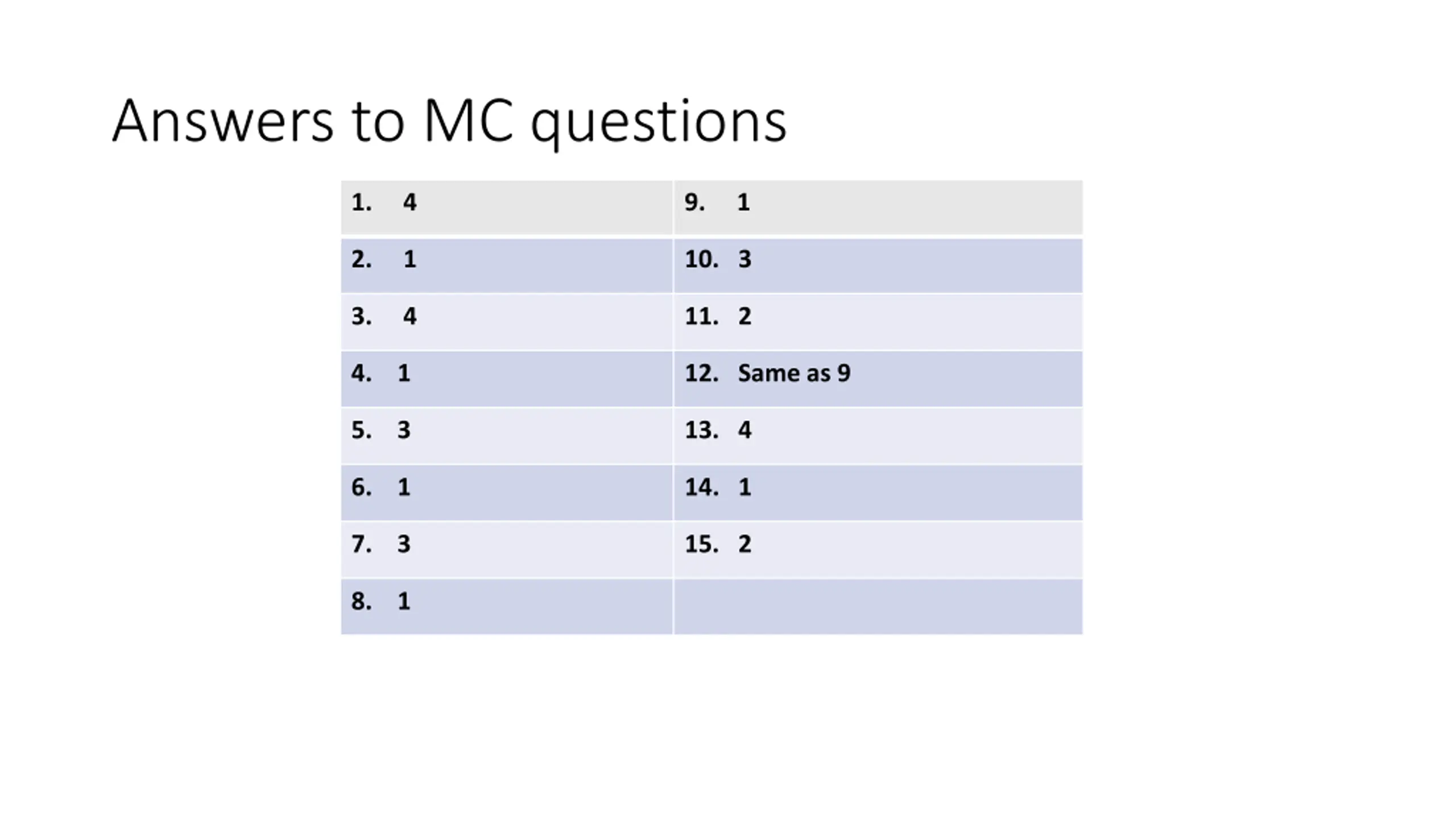 Answers to MC questions 1. 4 9. 1 2. 1 10. 3 3. 4 11. 2 4. 1 12. Same as 9 5. 3 13. 4 6. 1 14. 1 7. 3 15. 2 8. 1