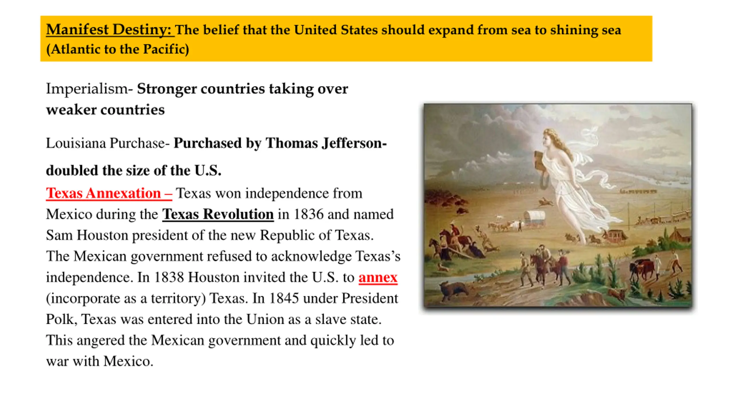 Manifest Destiny: The belief that the United States should expand from sea to shining sea (Atlantic to the Pacific) Imperialism- Stronger countries taking over weaker countries Louisiana Purchase- Purchased by Thomas Jefferson- doubled the size of the U.S. Texas Annexation Texas won independence from Mexico during the Texas Revolution in 1836 and named Sam Houston president of the new Republic of Texas. The Mexican government refused to acknowledge Texas s independence. In 1838 Houston invited the U.S. to annex (incorporate as a territory) Texas. In 1845 under President Polk, Texas was entered into the Union as a slave state. This angered the Mexican government and quickly led to war with Mexico.